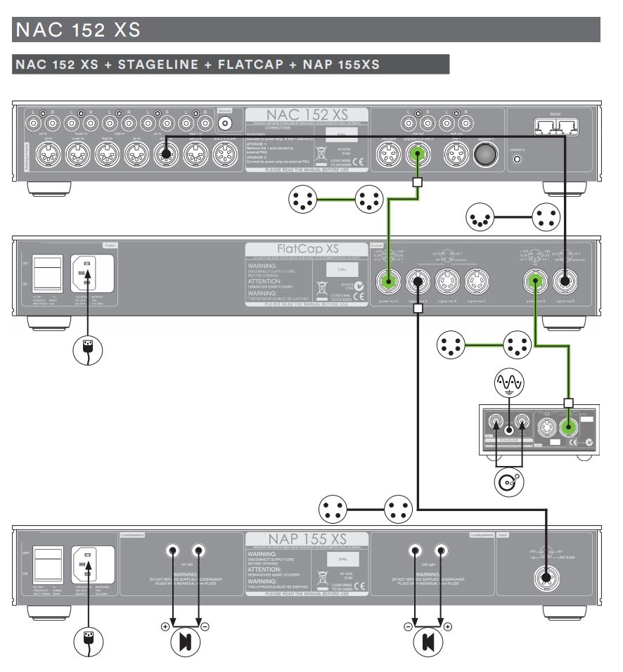 You’ll connect the Flatcap2xs to the NAC152xs via a pair of SNAIC5s (you should already have one that came with the FC2xs, you’ll need one more) for both the Stage 1 and Stage 2 upgrades. Then connect the FC2xs (from one of the DIN4s by the Stage 2 u/g DIN5) to the NAP150xs.