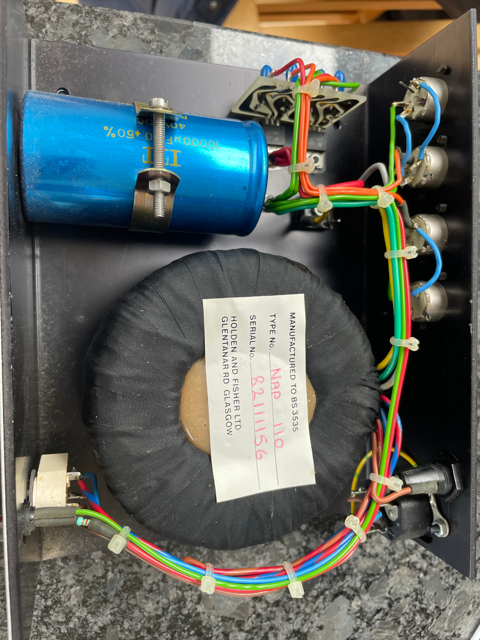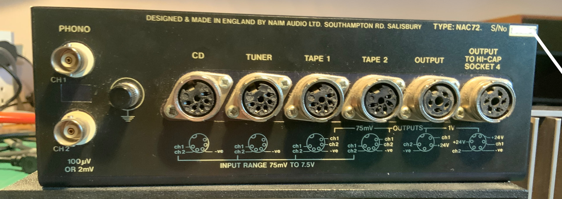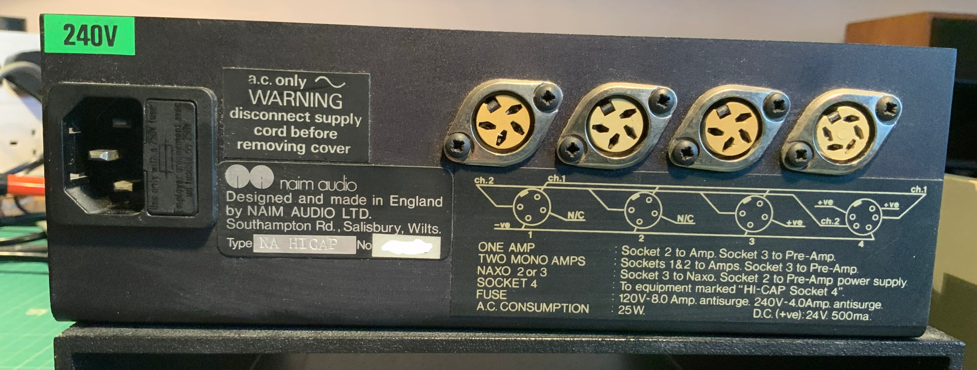 The second is the HiCAP power supply with the NAC 72 pre amplifier. This dates later than the SNAPS/NAC 32. The HiCAP is full depth in size and has a beast of a transformer and smoothing capacitors. There are again two separate 24 volt supply rails, but this time they are driven by separate coils on the transformer and separate smoothing capacitors, keeping them more independent from each other. The voltage regulator chip is the same (LM317) but in a different package. There is again the audio feed to link between the pre and power amplifiers.
