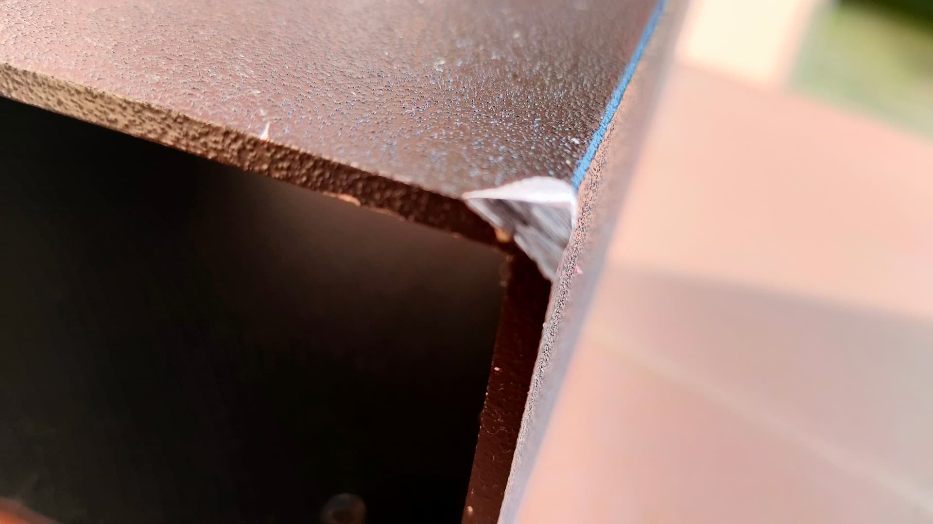A rear corner of the aluminum chassis has taken a hit and is uneven.