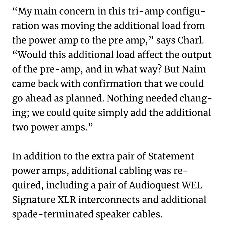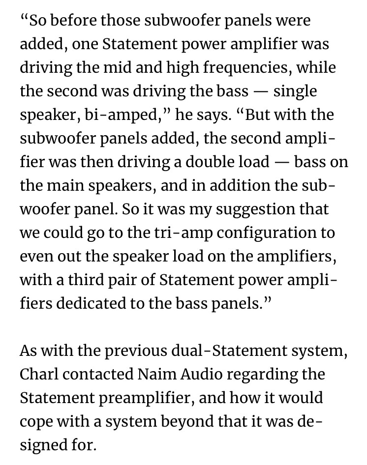 I know of at least two Statement customers with tri-amped set-ups; several more with bi-amped systems, too.