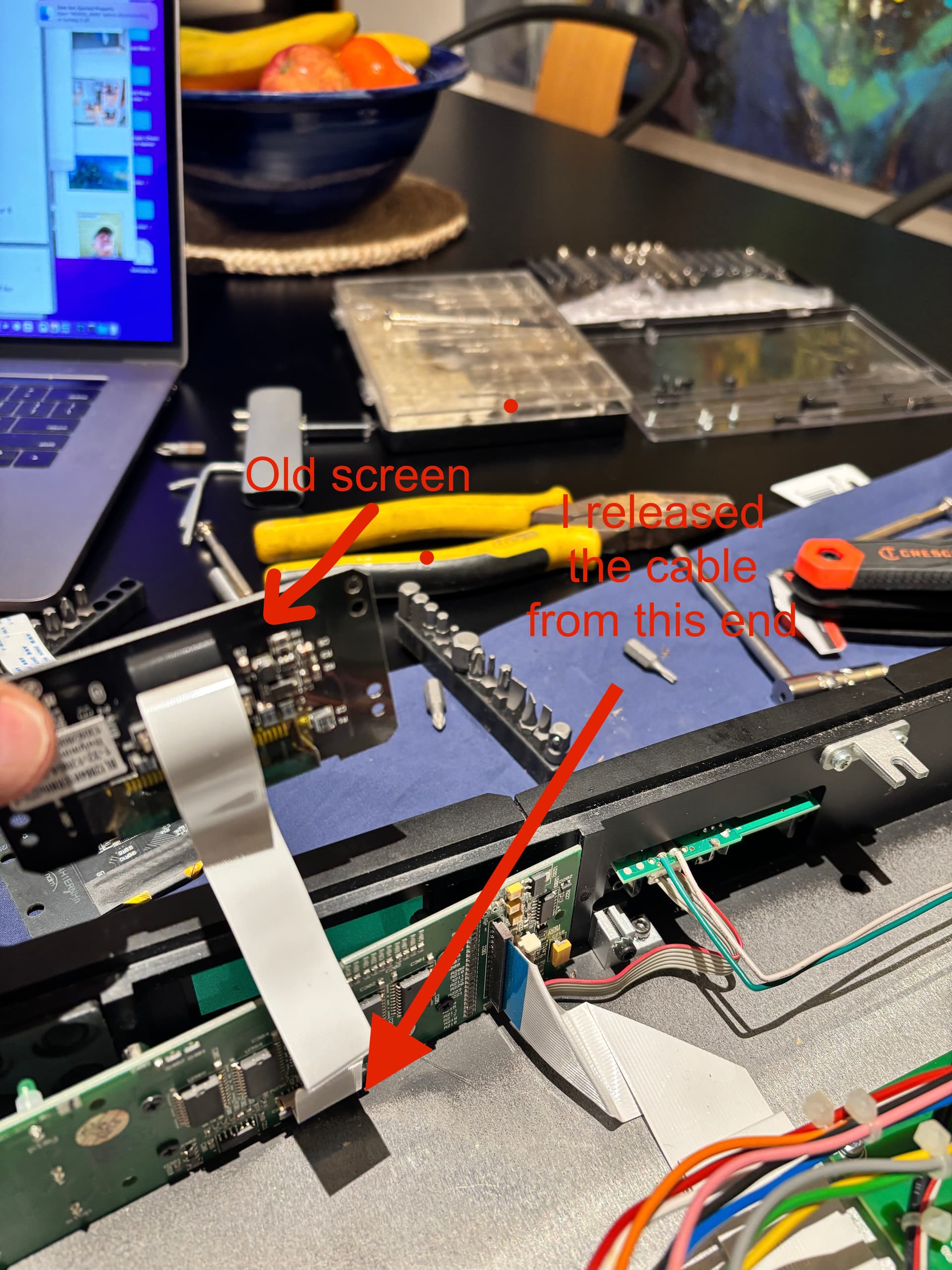 Just for anyone else here who is contemplating doing this, you don’t use the new flat ribbon cable unless you damage the existing one. The clamp to release it from the screen PCB is a small black clip lying on the PCB where the cable end is and you wiggle it back a few mm away from the socket until the ribbon cable is free. Very difficult to describe but easy to do once you find it! A good light helps you to see it!