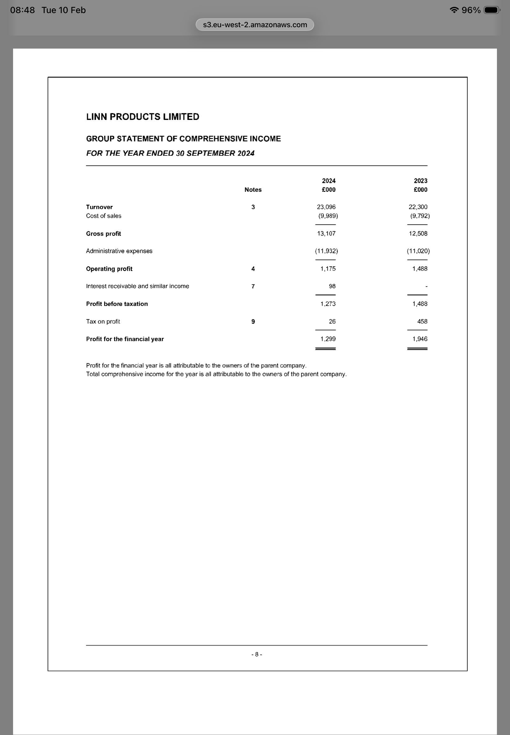 Linn achieves a gross margin of 56% vs Naim’s 35% suggesting Naim’s production costs are much higher (higher Cost of Sales relative to Turnover). This could be partly down to location, i.e. higher salaries of production employees in Salisbury vs Aberdeen, but more likely due to an inefficient and expensive supply chain and manufacturing process, including potentially more expensive components/materials.
