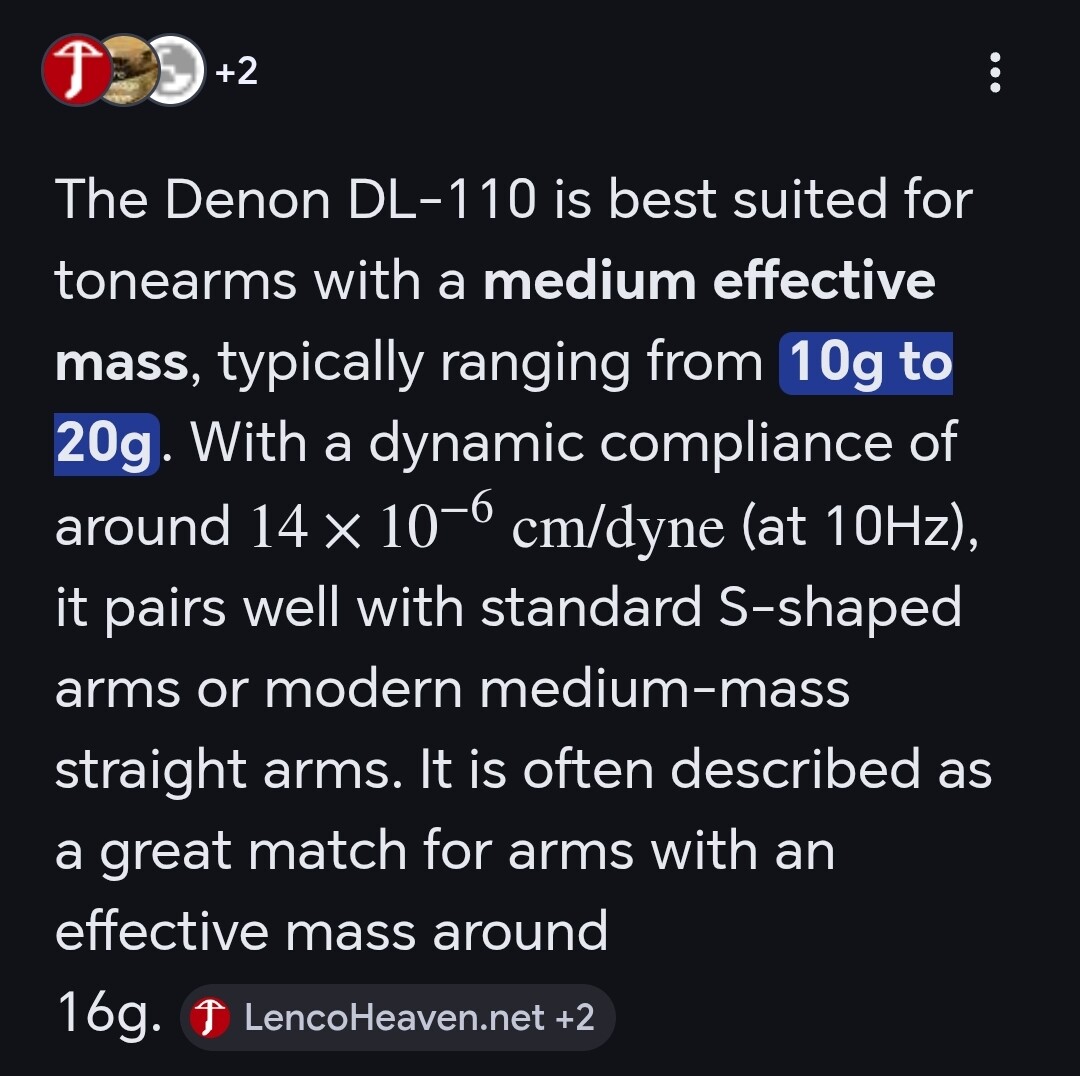 I’ve just spent an hour pondering the arm/cartridge match, looked at specs, reviews. The 110 seems to be very light, then it doesn’t help that different makers measure compliance differently so compliance/resonant frequency tables might not be accurate.