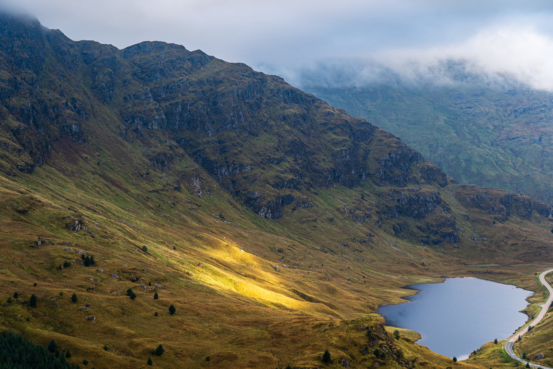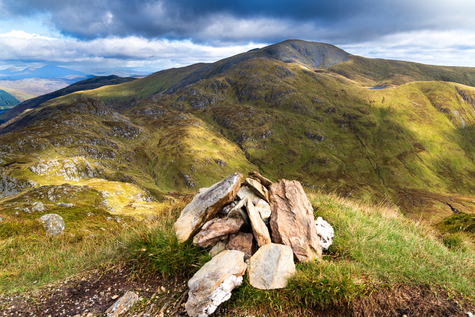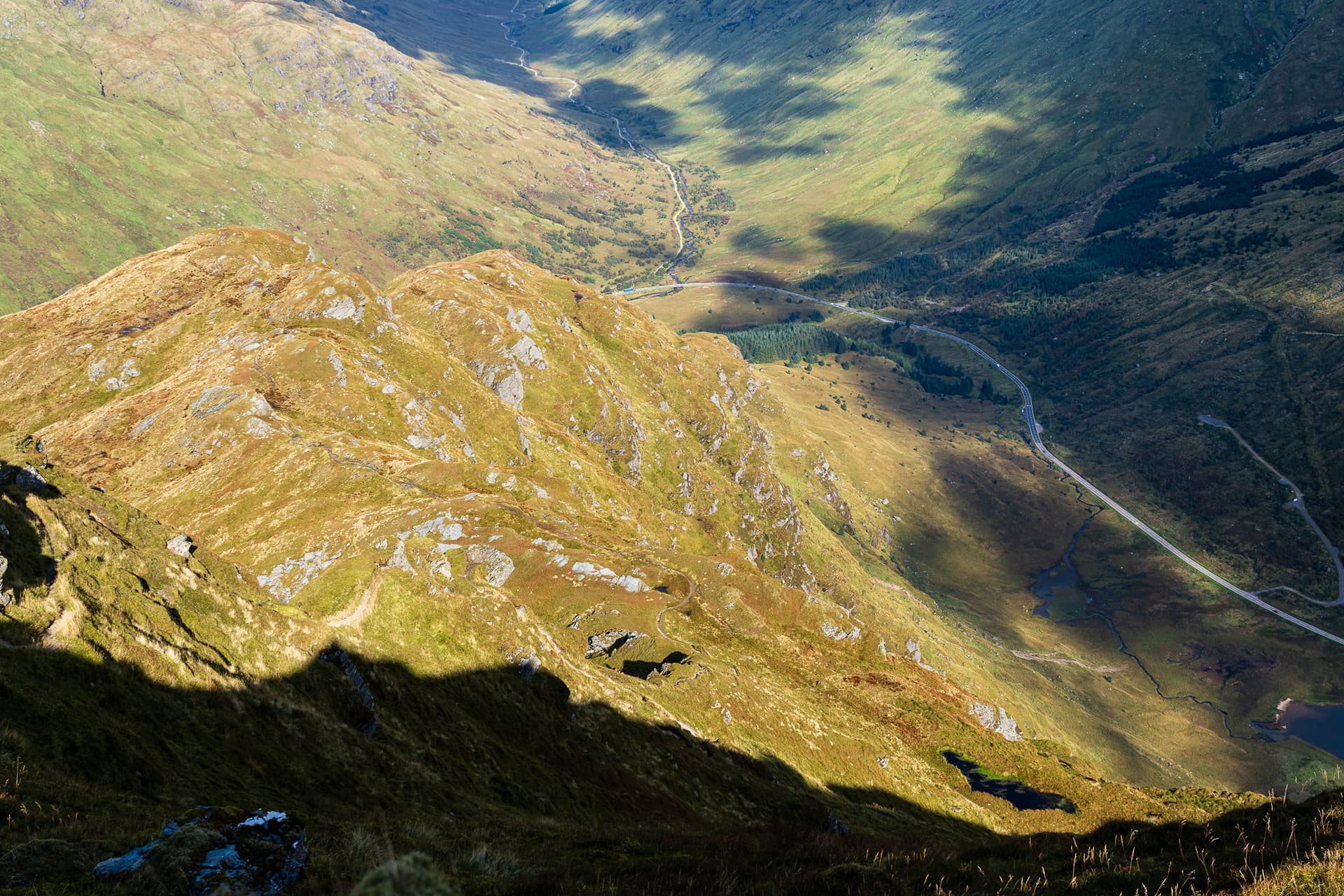 A couple showing the changing conditions in one mountain day. The first shot is from the morning ascent of Corbett, Ben Donich, looking across to Beinn an Lochain. The second is from the late afternoon summit of Beinn an Lochain, showing the descent to come. Arrochar Alps, Scotland.