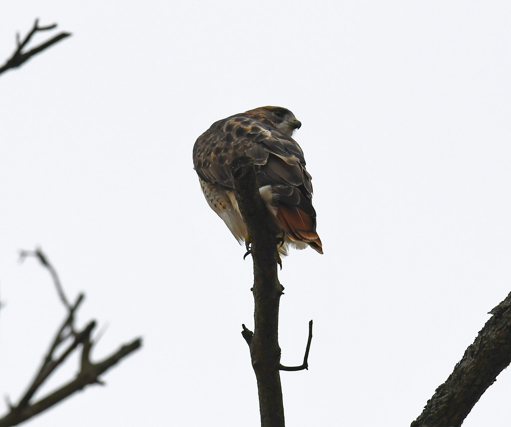 Definitely not in a combative mood. Surrounded by dead Ash trees, grey skies above and cold wind raffling his feathers, the hawk is just content to lose momentarily his fierce looks, almost accepting the human company from below.