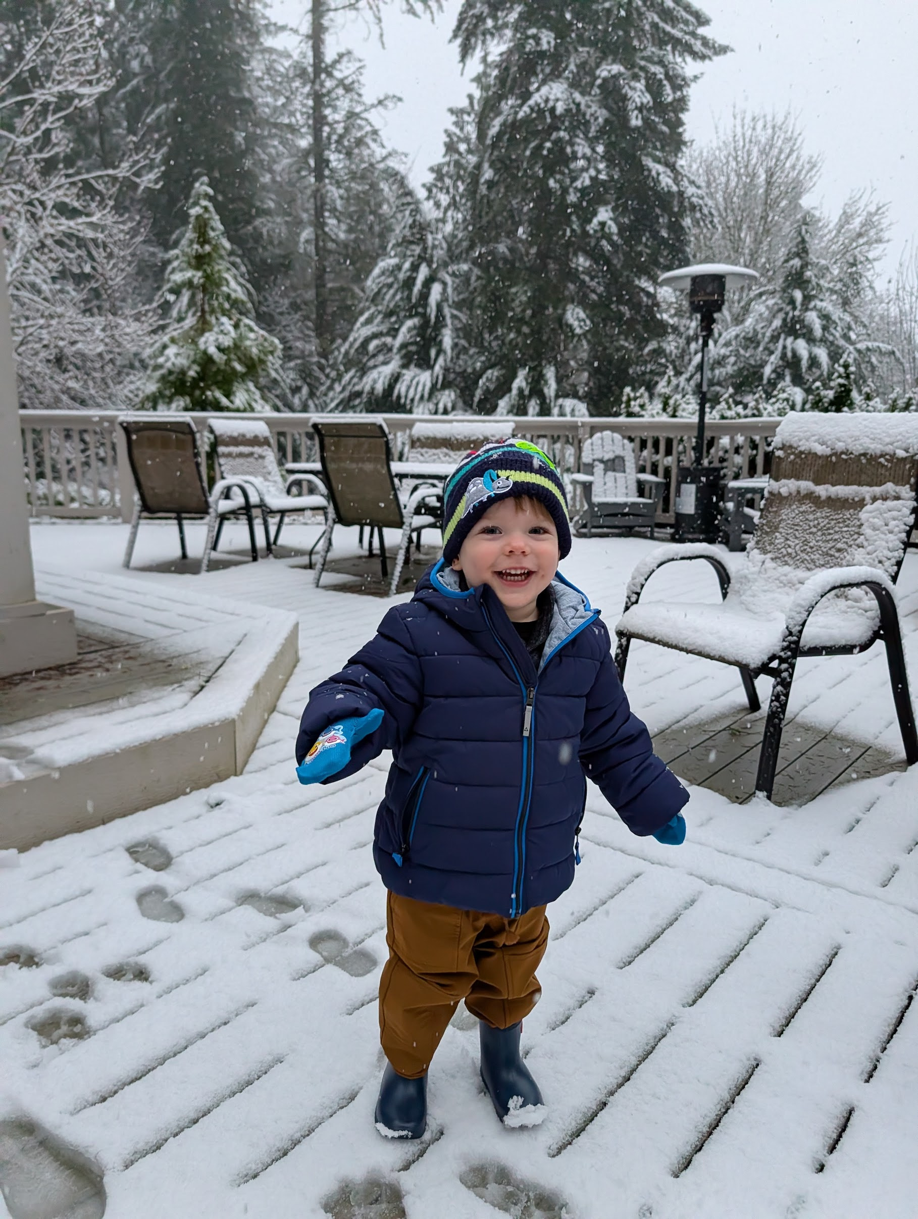 Here is Zach on the deck a couple of days ago. It’s his first experience of that white stuff.