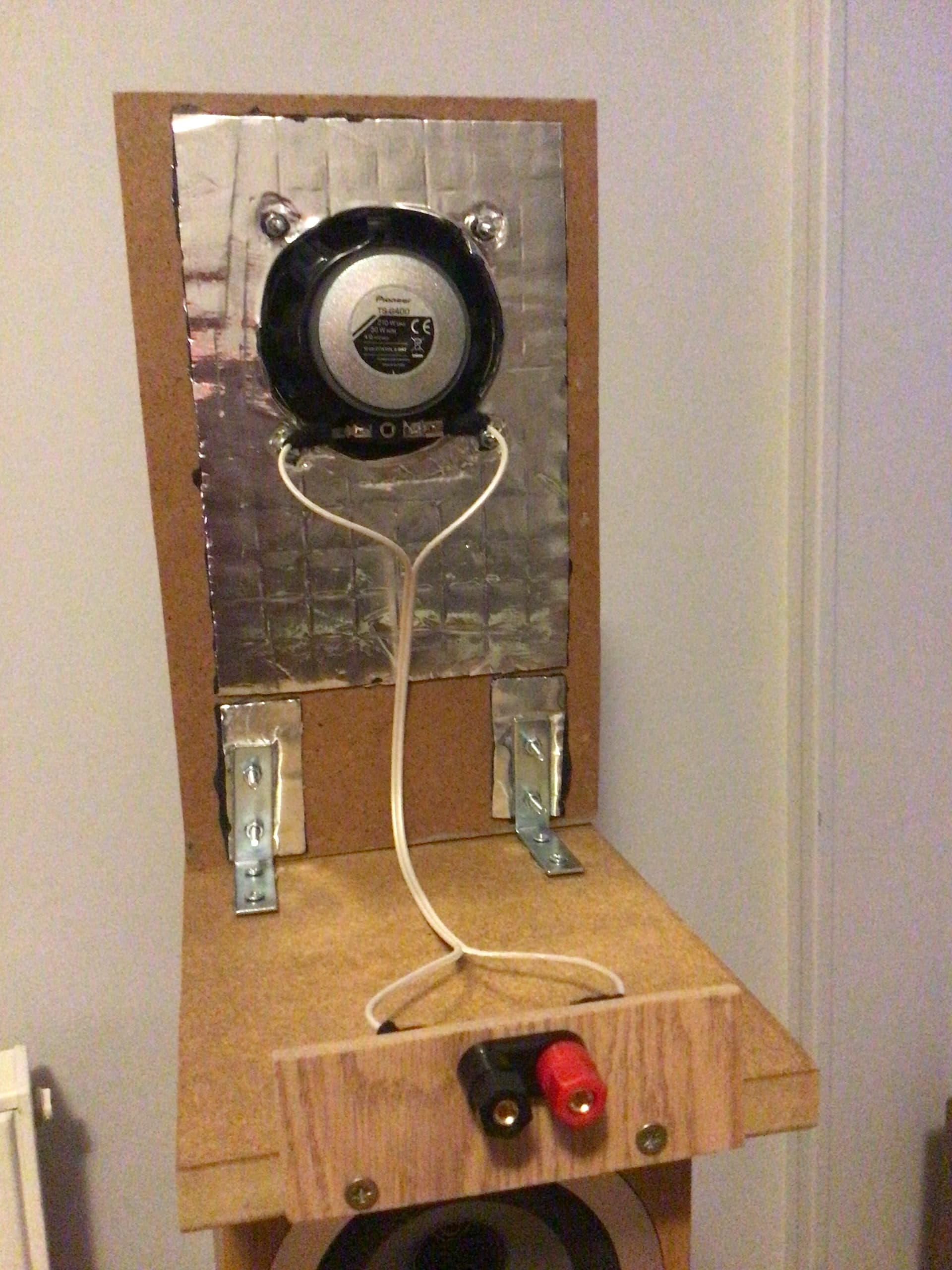 Originally, I planned to stick two flooring boards back-to-back for the baffle but, despite leaving them clamped overnight with the type of glue that normally works really well, they separated when I started assembly so I went the sound dampening route instead.