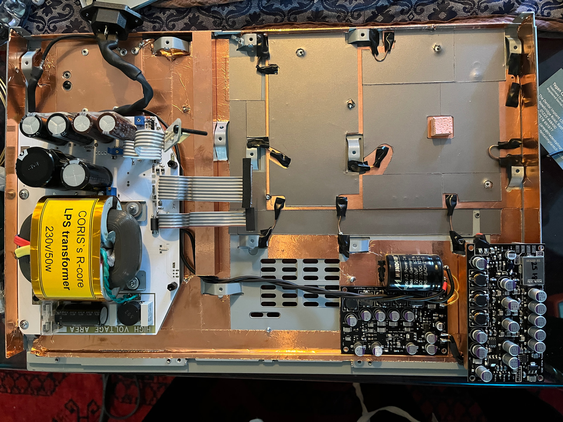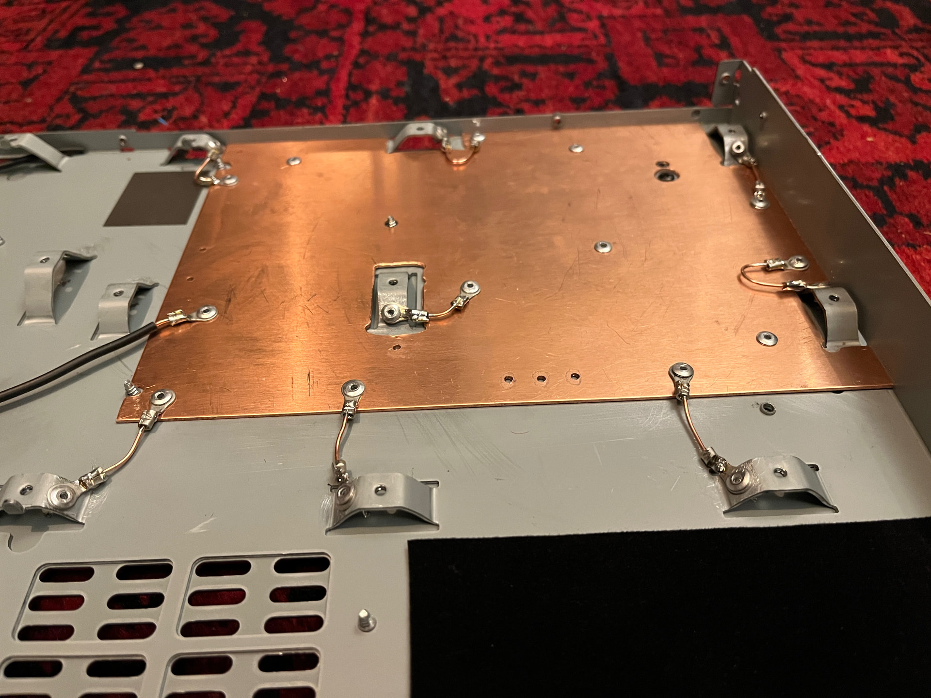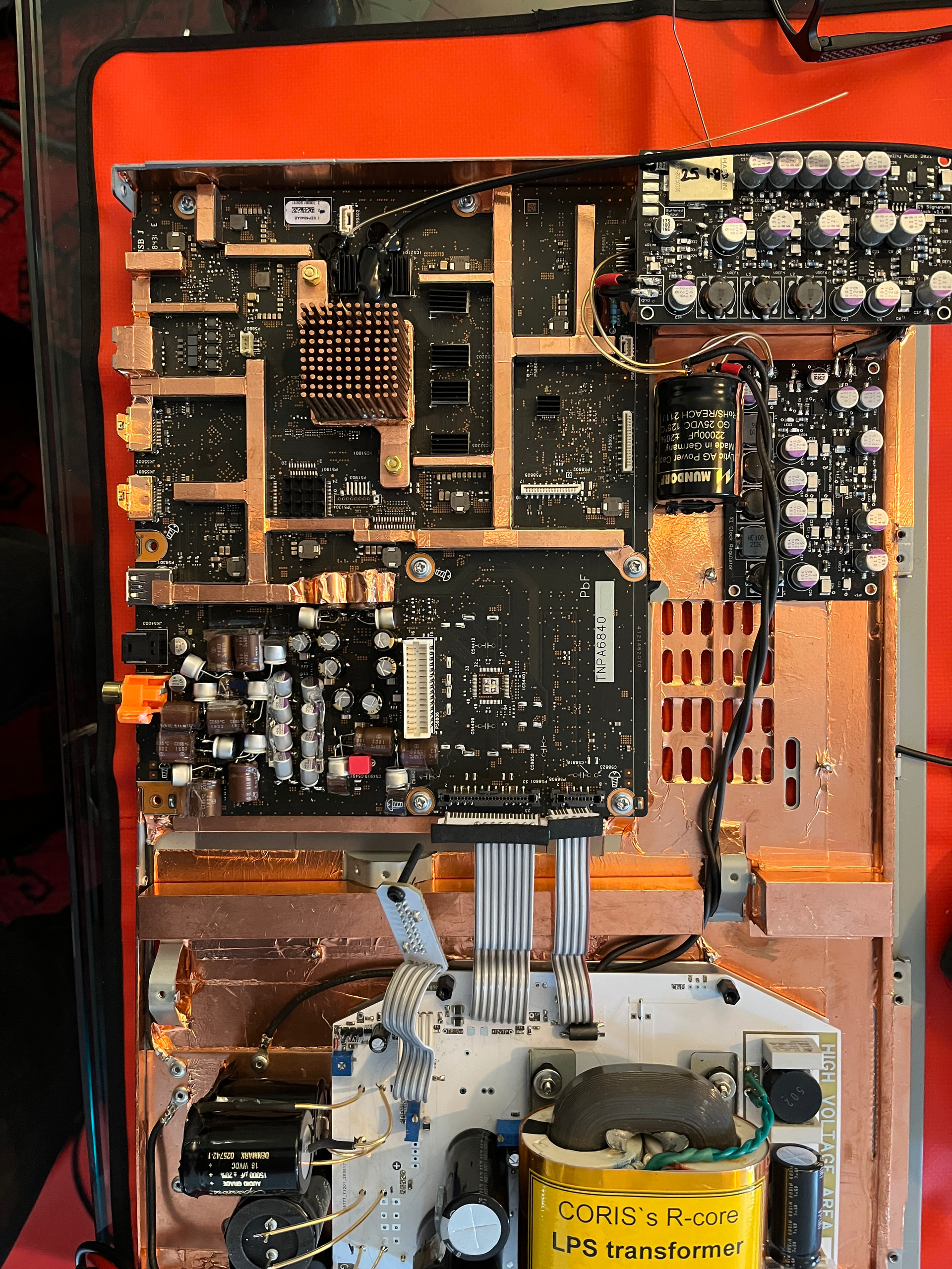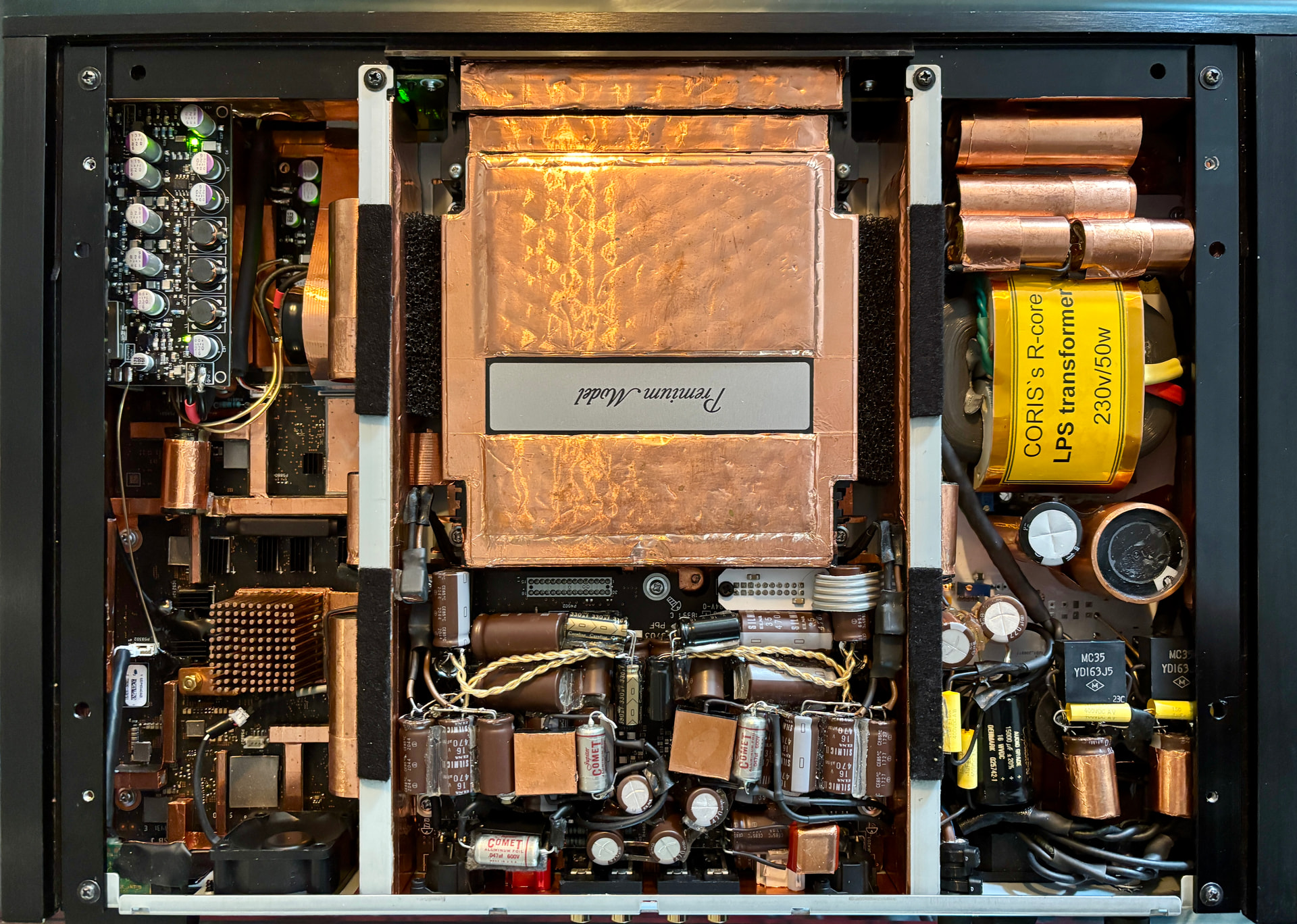 I have a stock unit with AKM DACs as a reference and have many times A-B’d single cap additions with soldering iron in hand. The Copper Chassis was a big upgrade so much so I rebuilt the modified unit in the original chassis. It really surprised me a big step up in Dynamics and ‘body’, projection and solidity. I added a GND plate and experimented with GND locations, the steel chassis acts as a GND link with the design - yuk. As you probably know steel is around 6% the conductivity of copper and is sonically not great. I foiled where the chassis links are made to the chassis so it was copper all the way through. I also used 3M EMI/RFI absorber to add to shielding and noise reduction. the black was just insulation