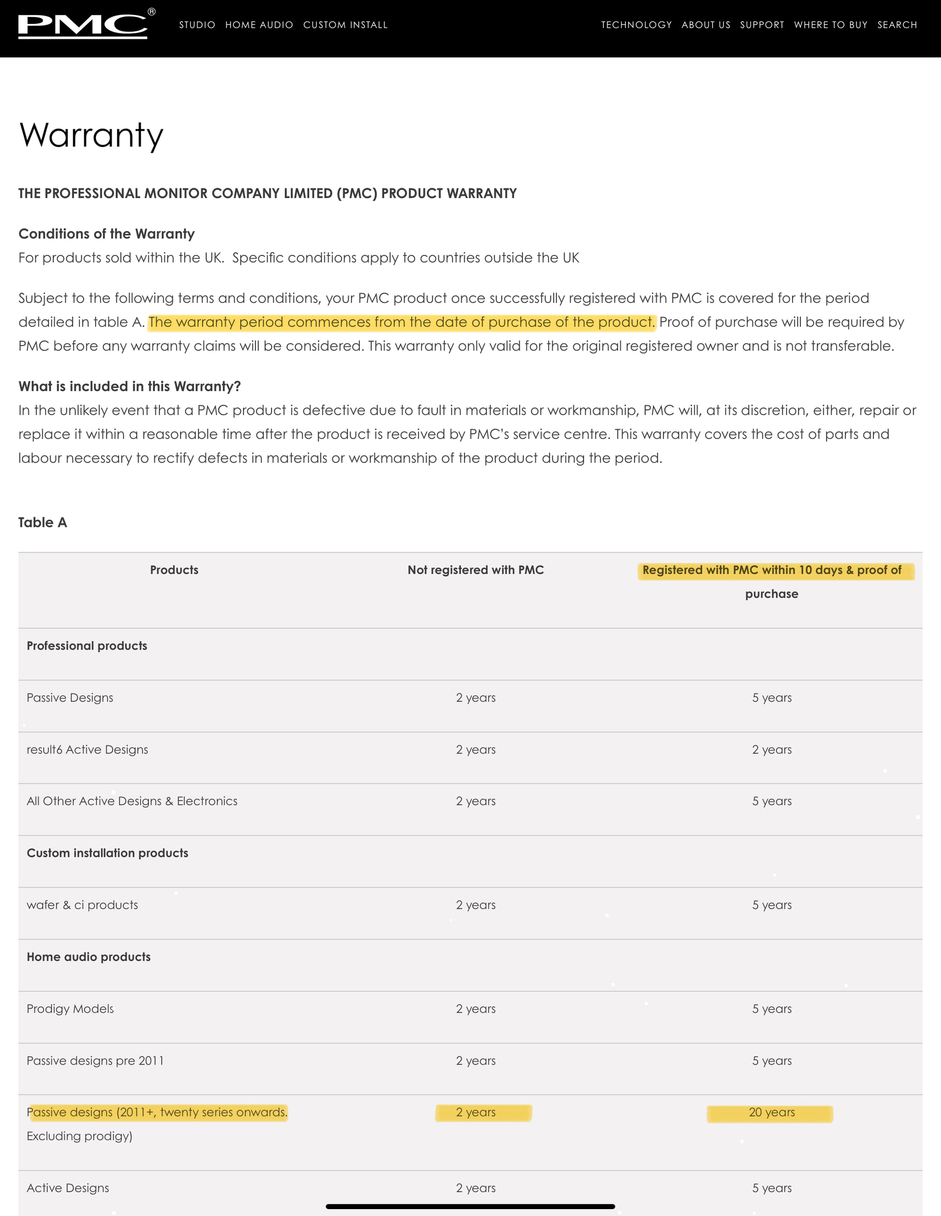 PMC offer a class leading 20 year warranty on most of their speakers. There is a massive, small print, BUT here though. If you don’t register your speakers with PMC within 10 days of the purchase date (as written on the invoice) then that warranty is downgraded to just 2 years!