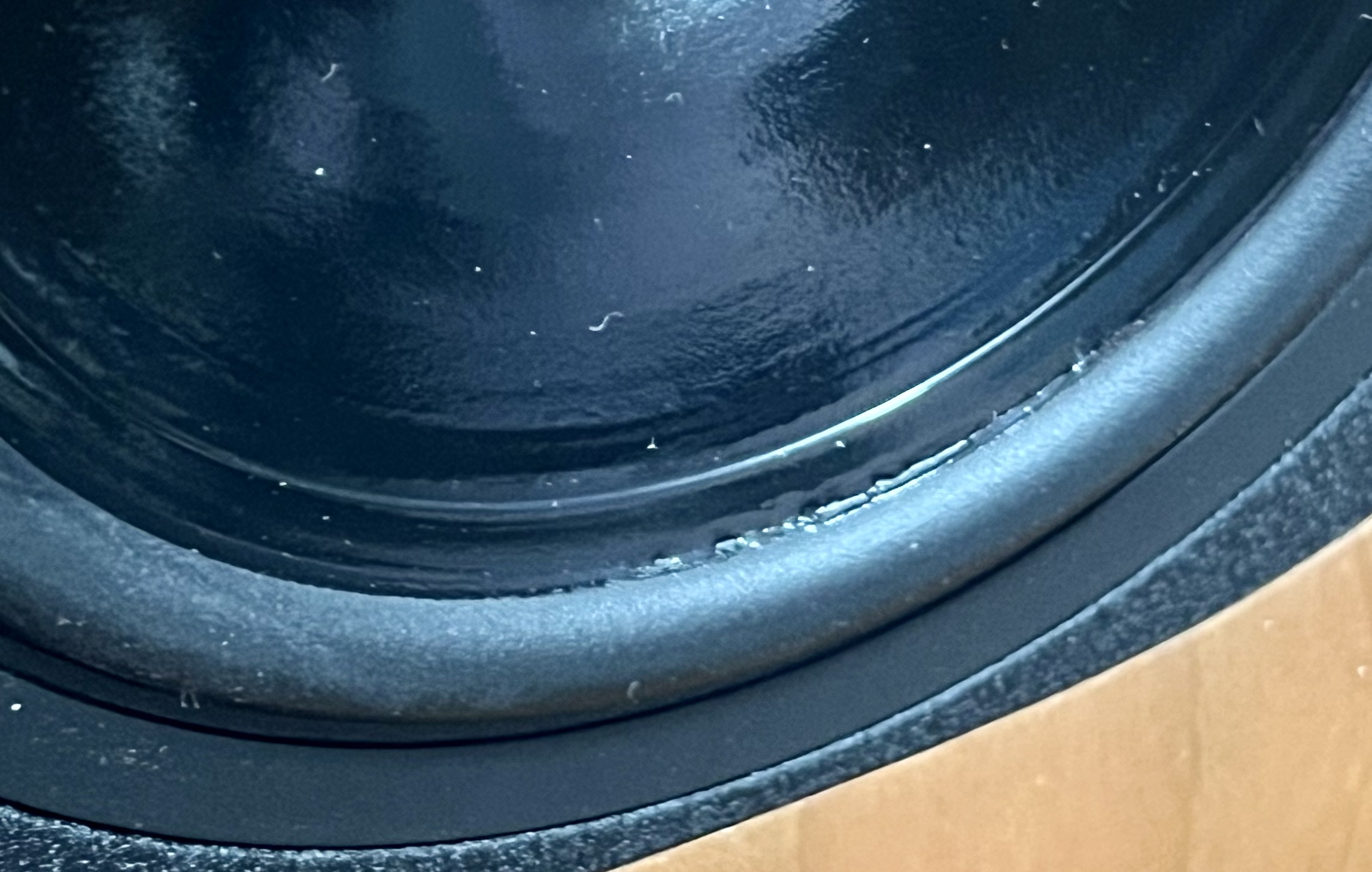 My observations: It seems like the application of the doping material was not aligned properly, as the other side not shown has more of the doping material that goes onto the surround, whereas the side I showed barely goes onto the rubber surround. The slight misalignment probably resulted in the doping material having poor adhesion at where the surround meets the cone.