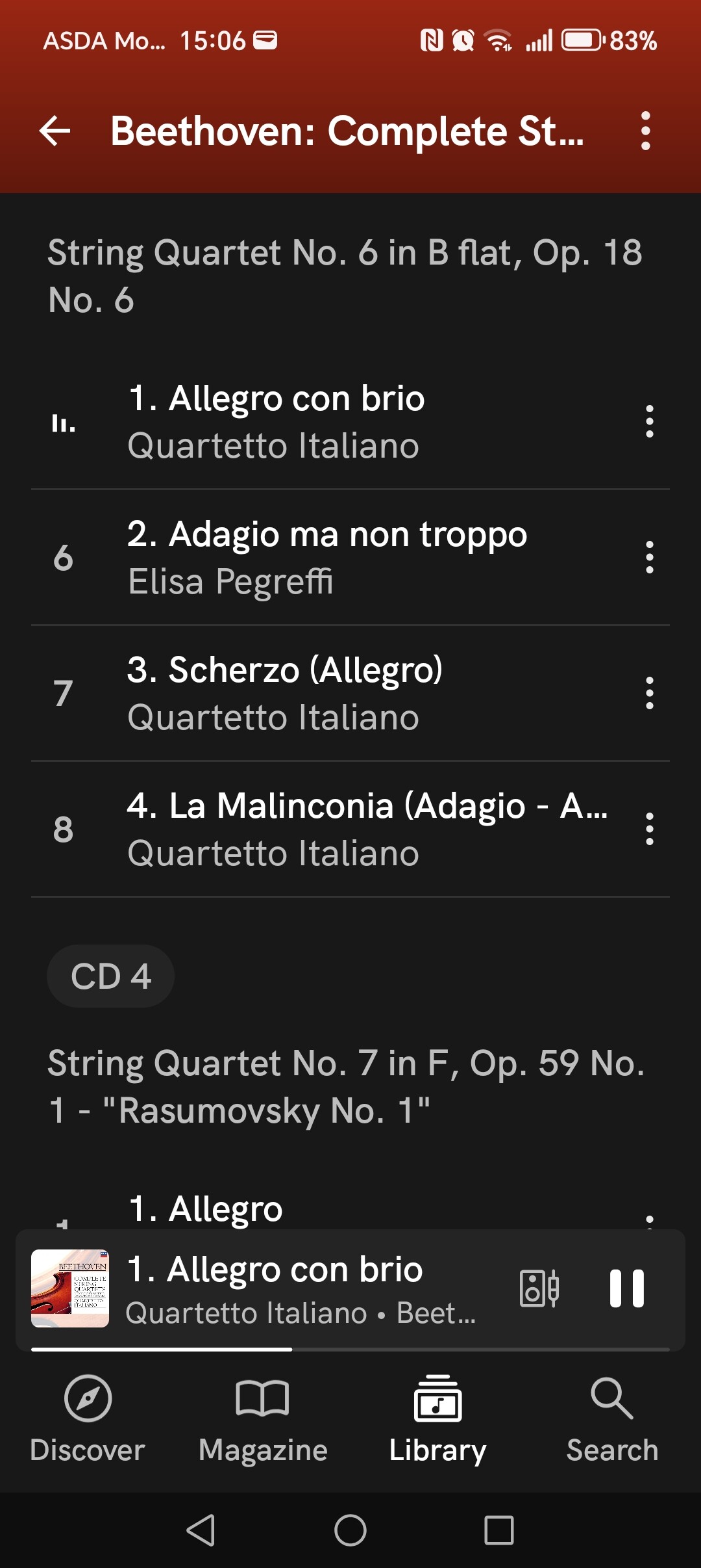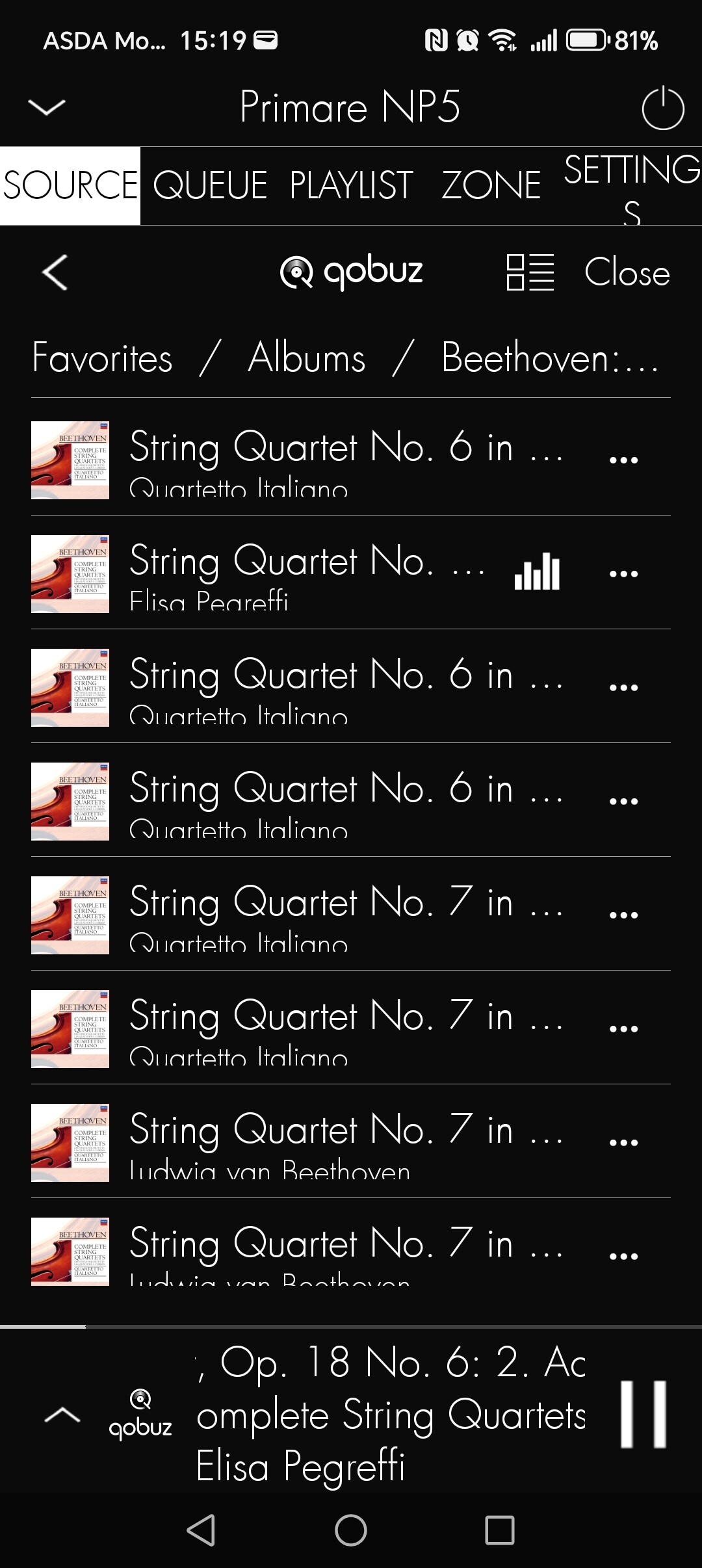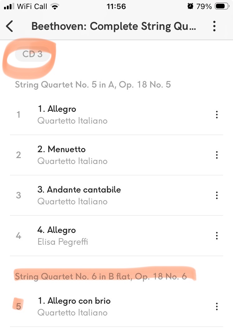 On my iPhone using the Qobuz Connect app, when I first select the album the track info includes the disc number and Quartet number, but not when I’m looking at the play queue.