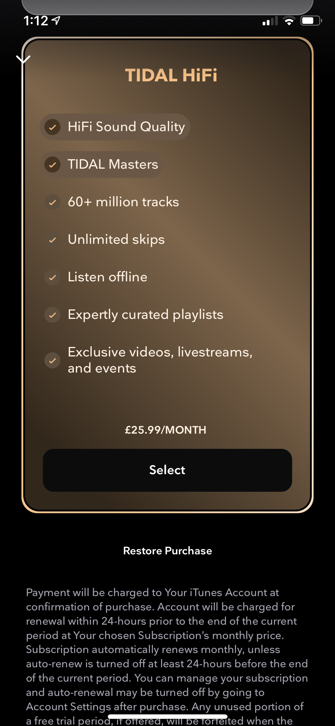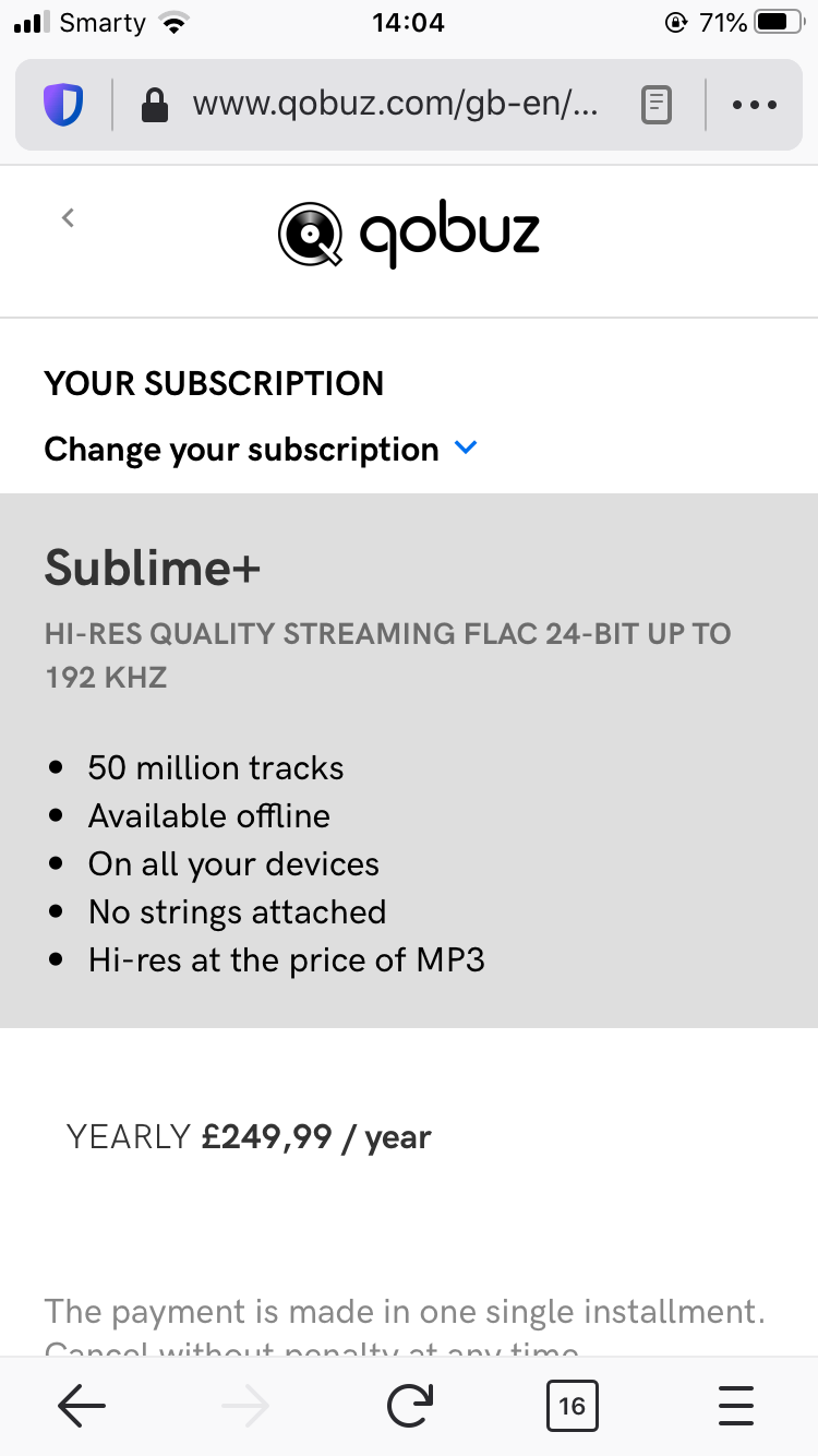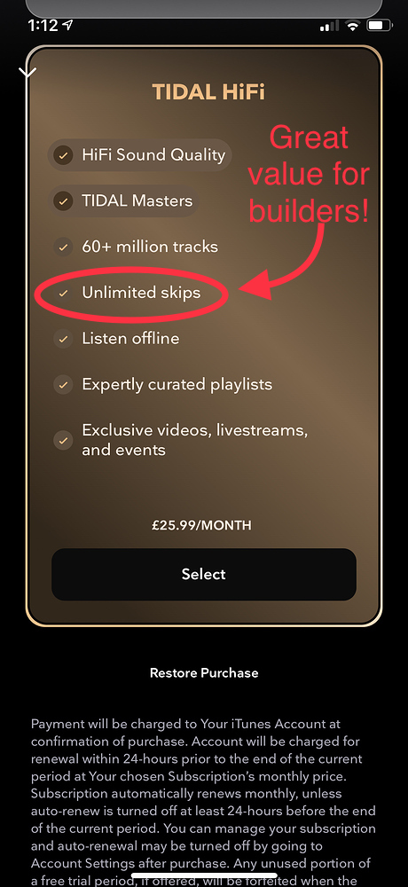 Thanks for the reminder on Tidal - I enjoyed the 4 month trial for £5.99 or whatever it was, but the curation is not to my liking at all. I’ve paid Tidal for a couple of months but don’t really use it much. It’s hard to find the pricing plans as all listed in $ when I try, but I’m still being charged £19.99.