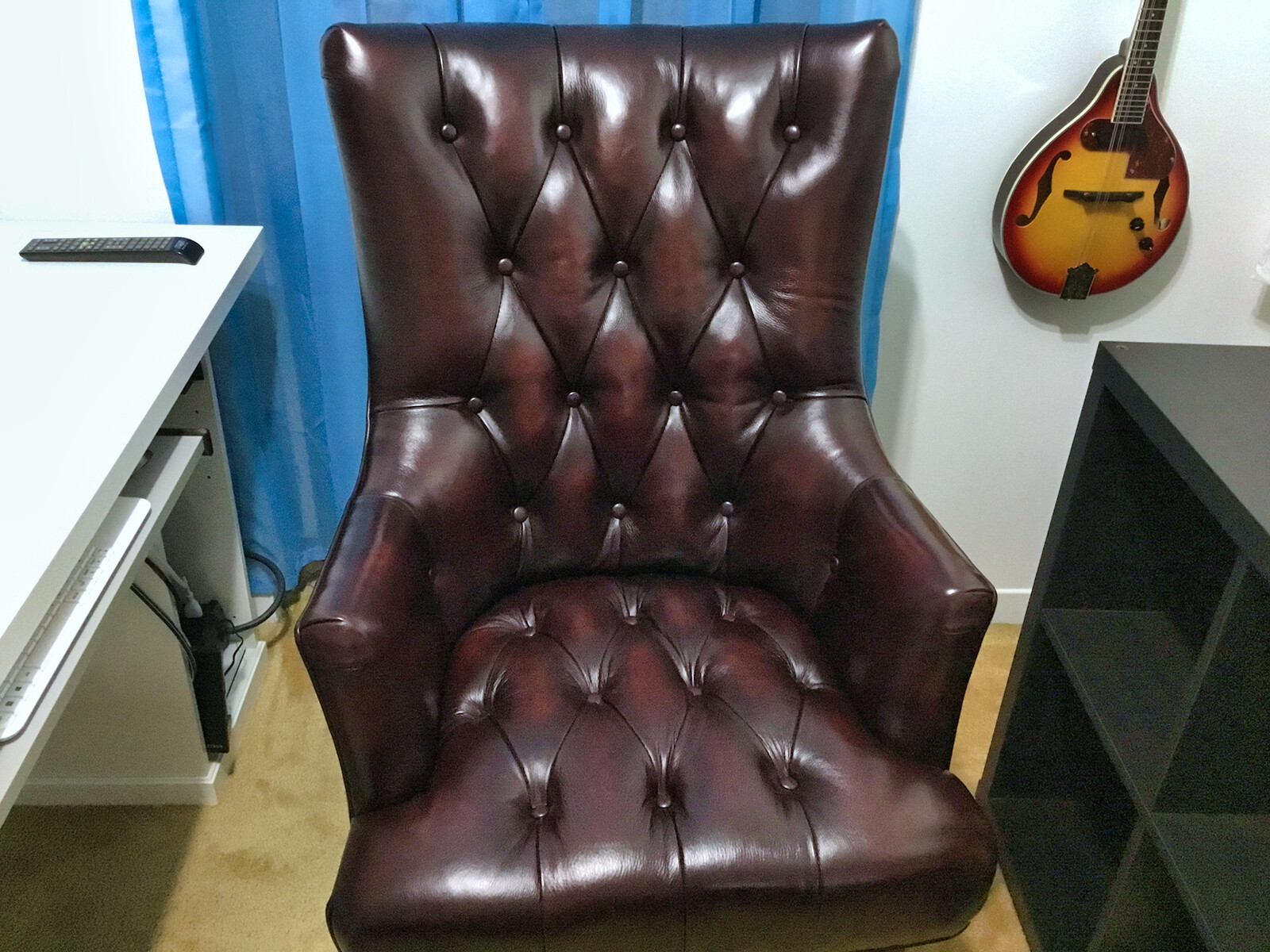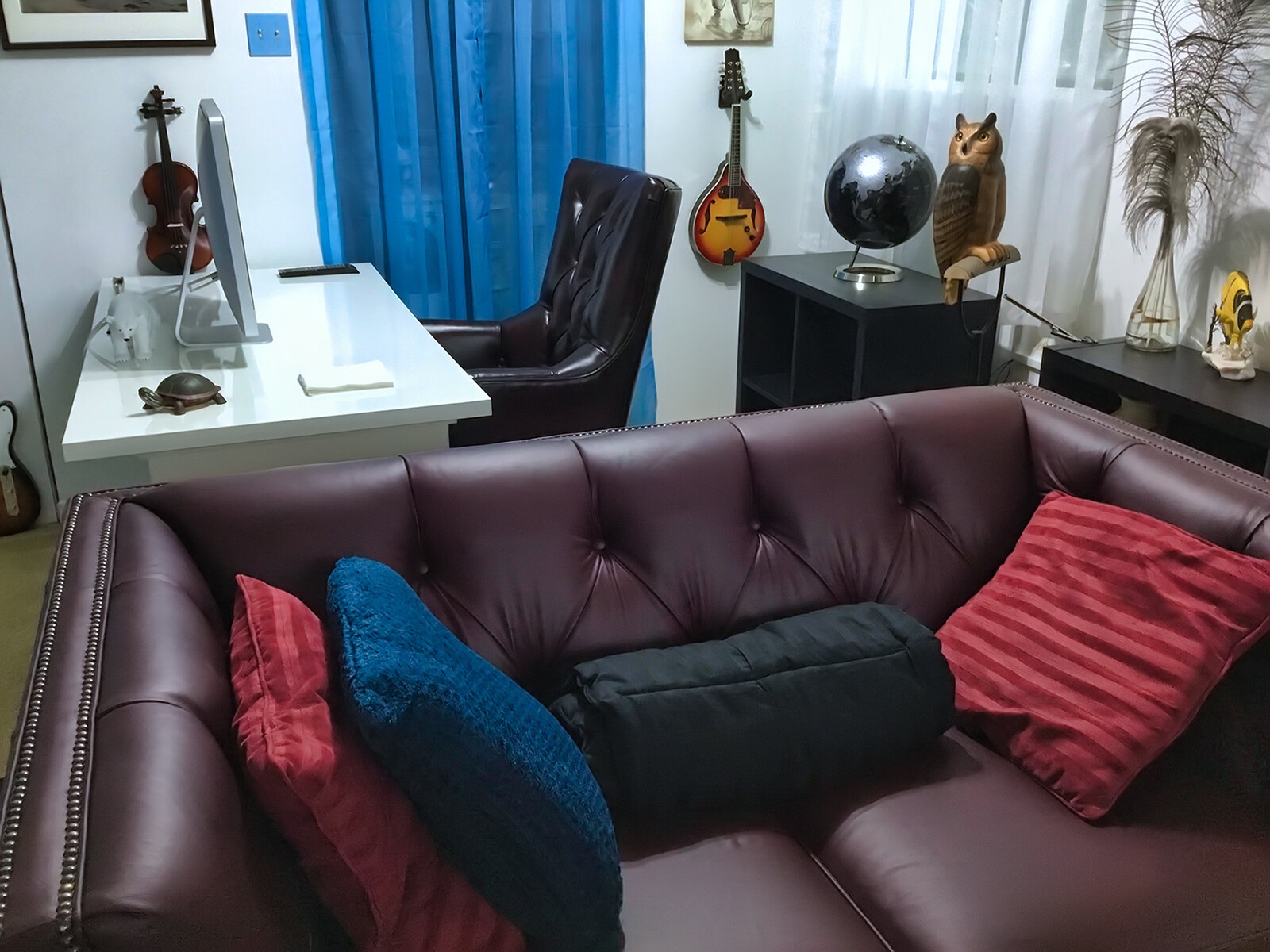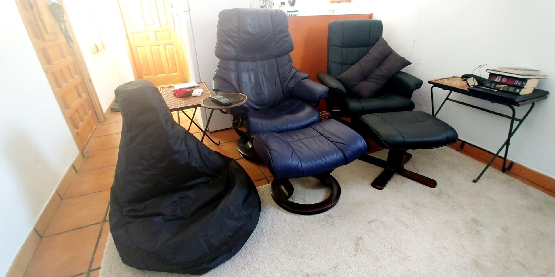 The brown leather one is used daily when my wife is home - it’s easy to move. The big red, when she’s out for awhile: I rearrange the room!