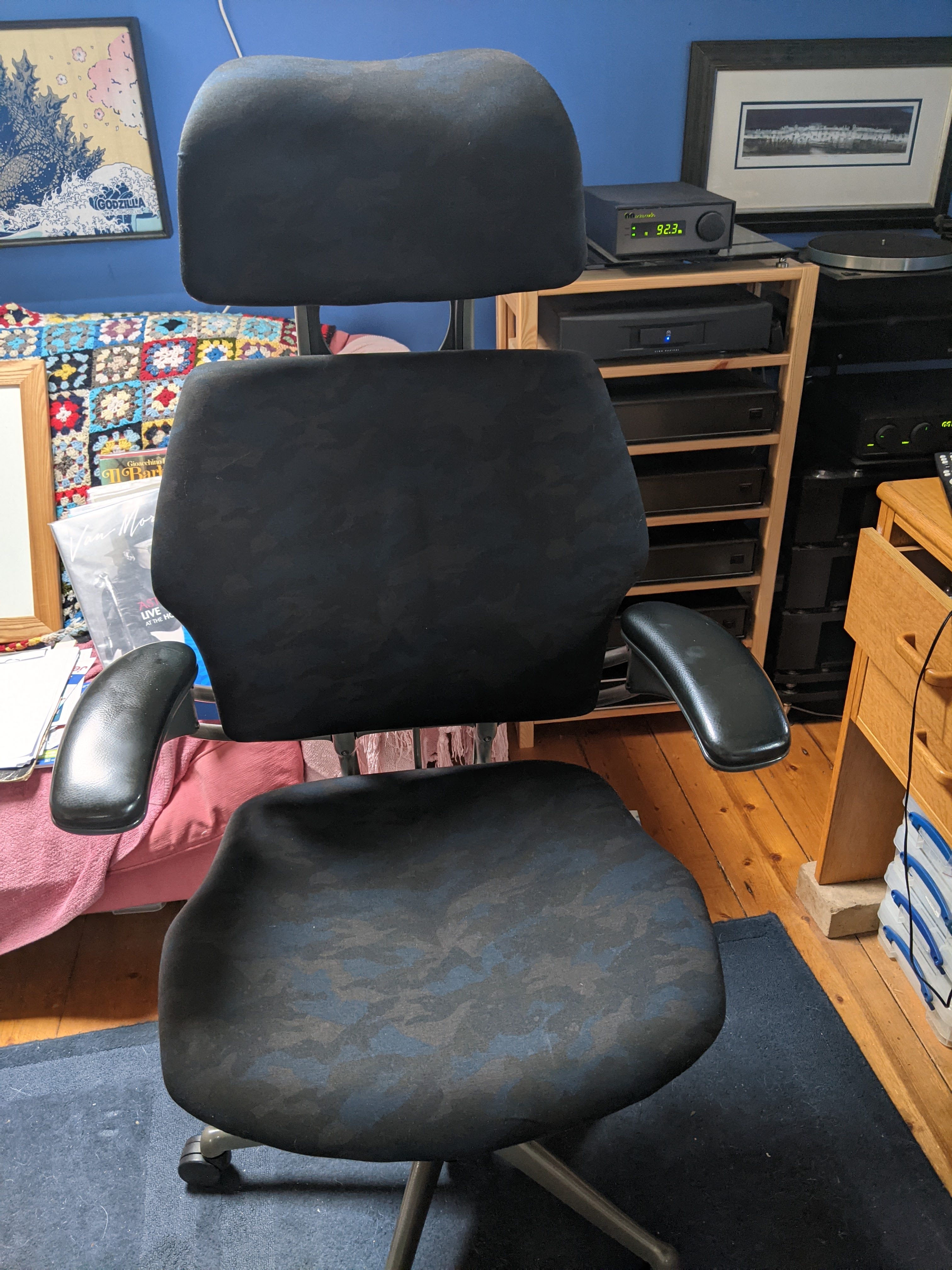 My chair came for free from my brother-in-law who worked for a local council. Don’t know what make it is but seems well built and has all the adjustments I require. Only problem was the rather tasteless blue/purple colour. Eventually the fabric gave up and I set about recovering it.