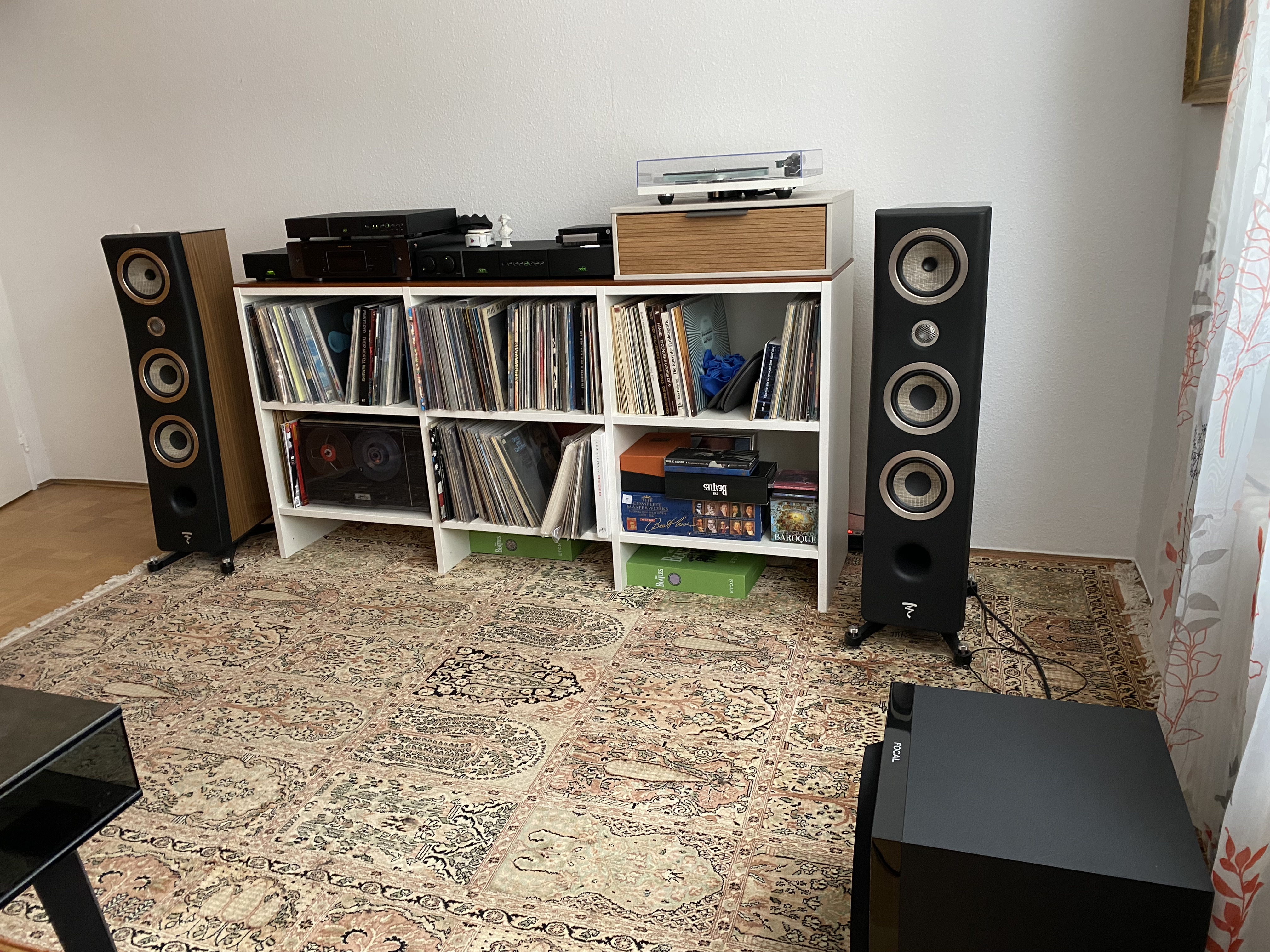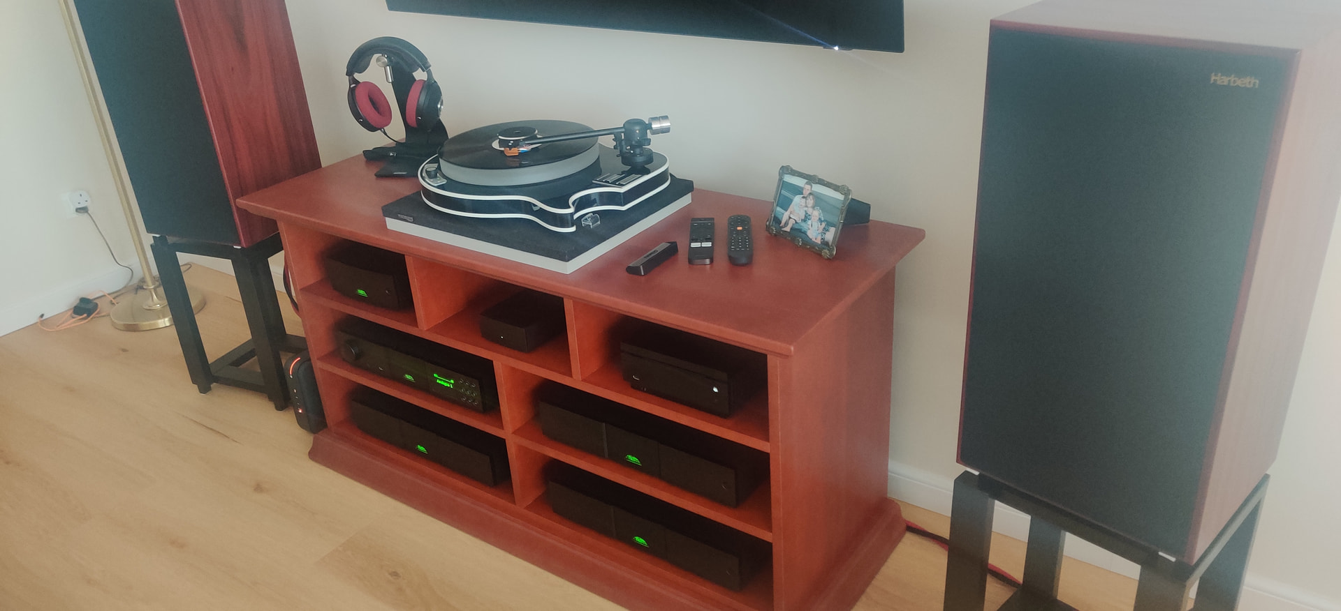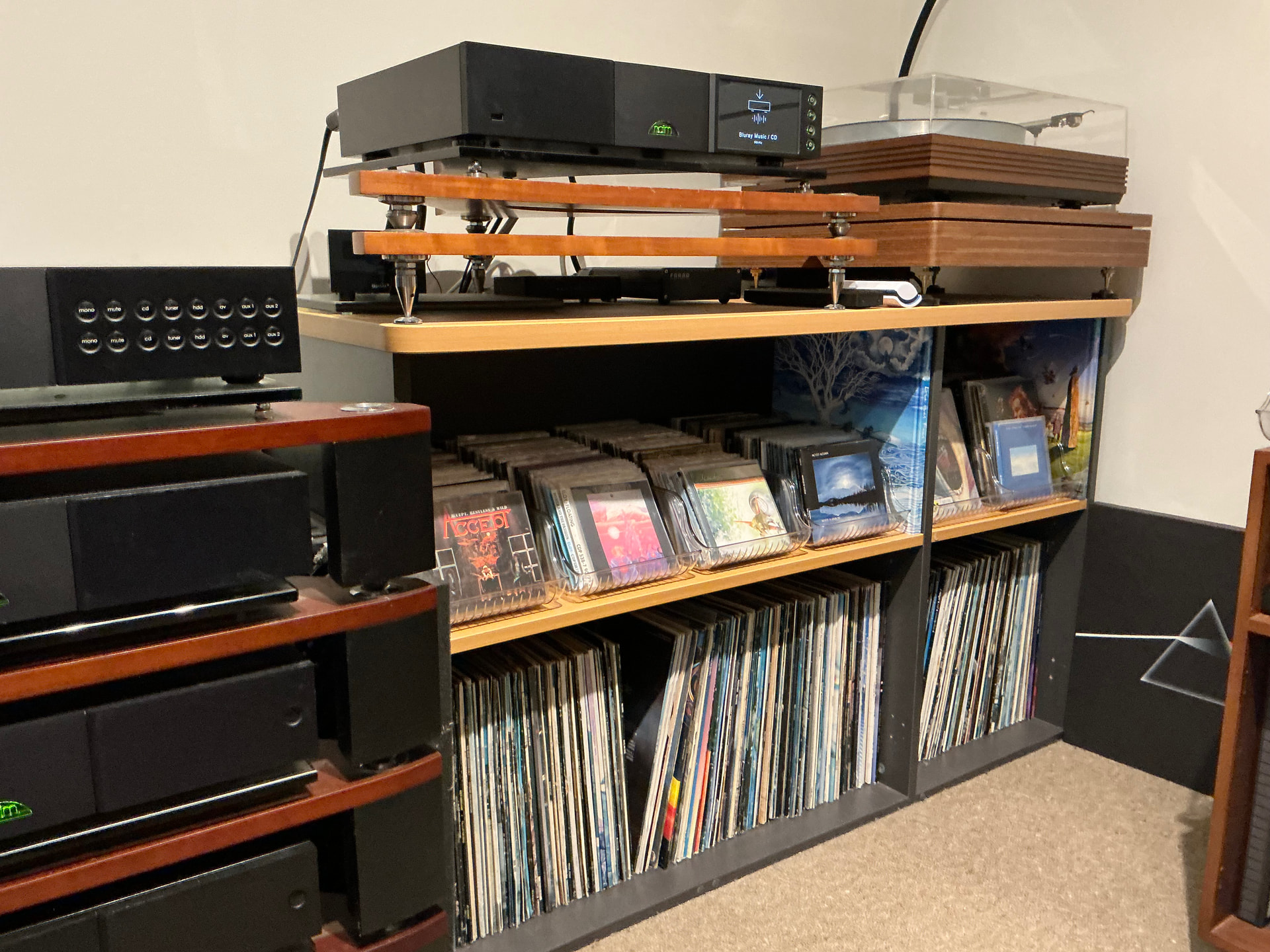 I’ve removed the doors from the office Crescenda with the bottom shelves for stacked records, and the upper shelves have flip trays for CDs and DVDs (both in storage saving sleeves). ND555 and LP12 on top, plus switch, PSx2 and phono stage on top.