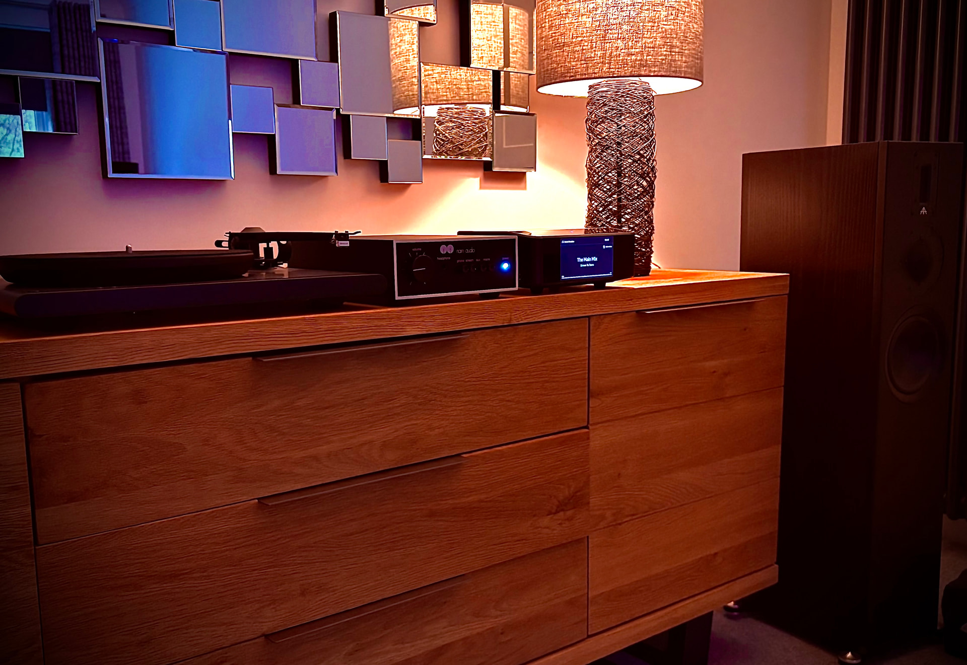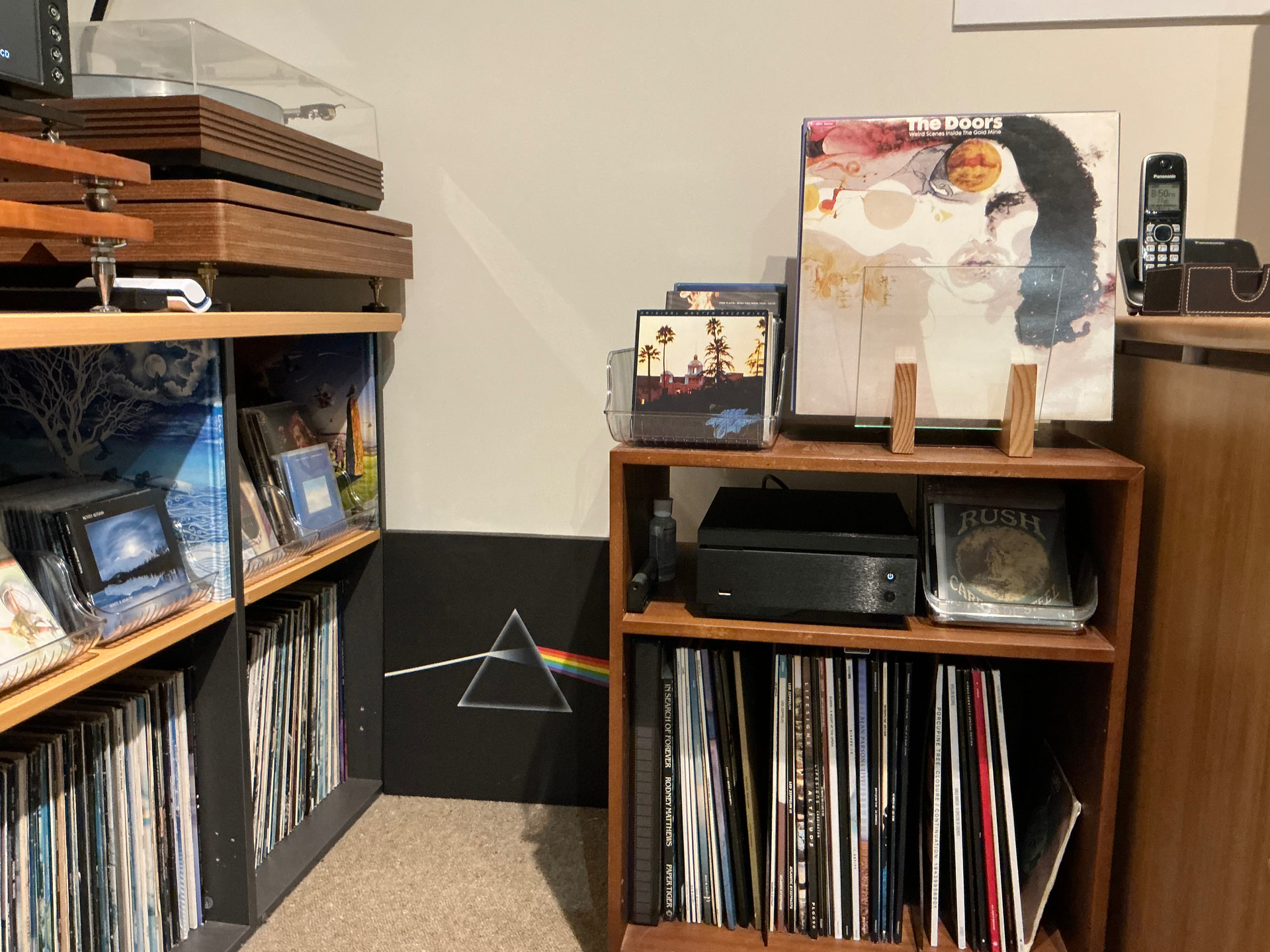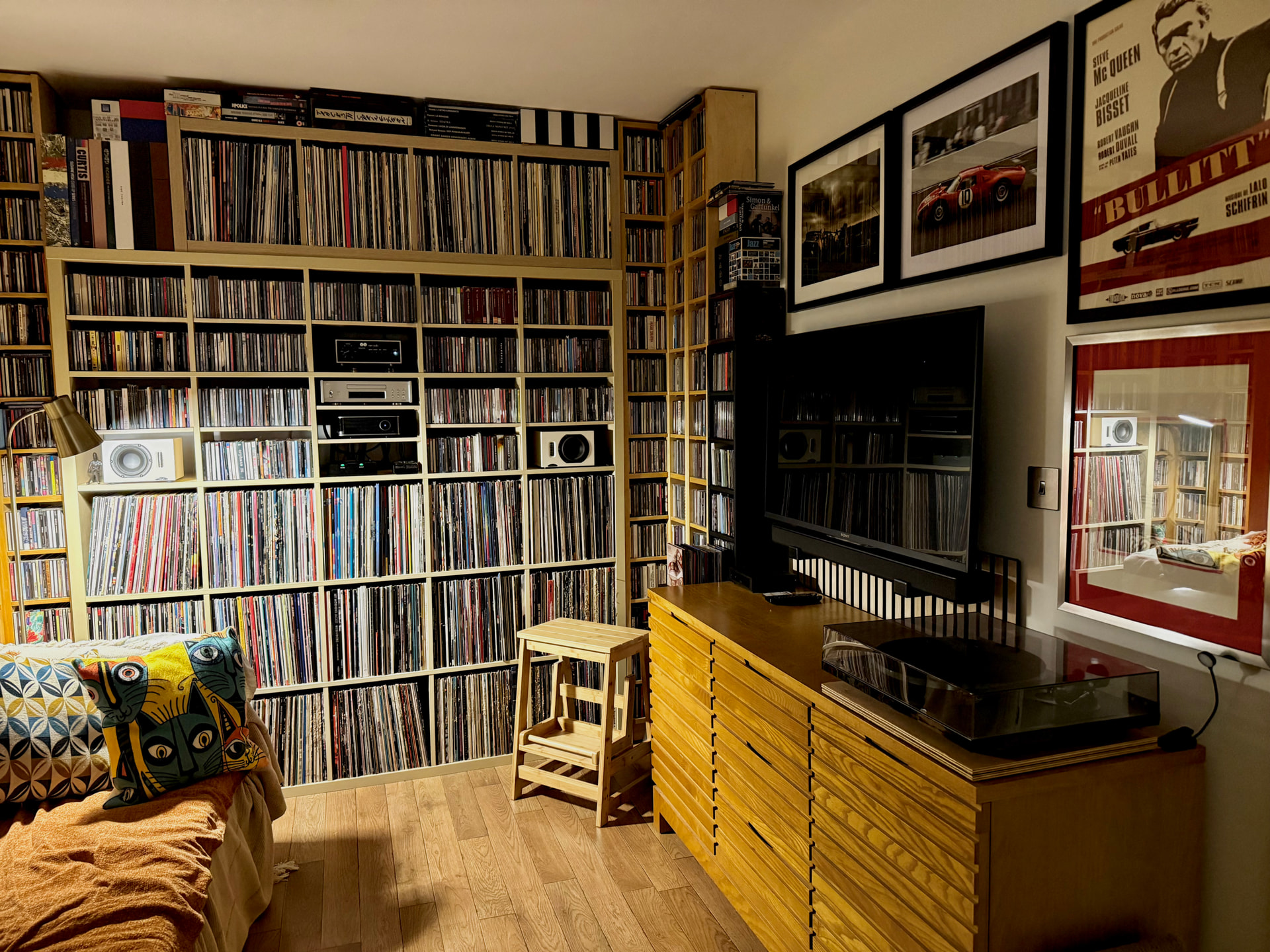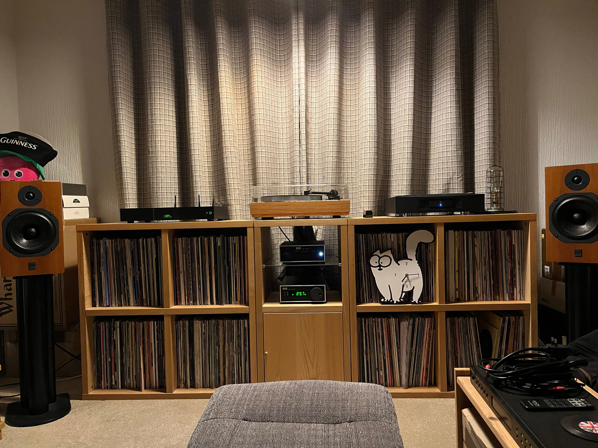 This is my Mums old stereo cabinet that we had in the family home when I was a lad. I’ve removed the bottom doors so the records are visible, then used the middle section for the Uniti Core and a flip tray of CDs. Then on top I have flip storage for reference SACD and Bluray, and some favourite records and the currently played one at front.