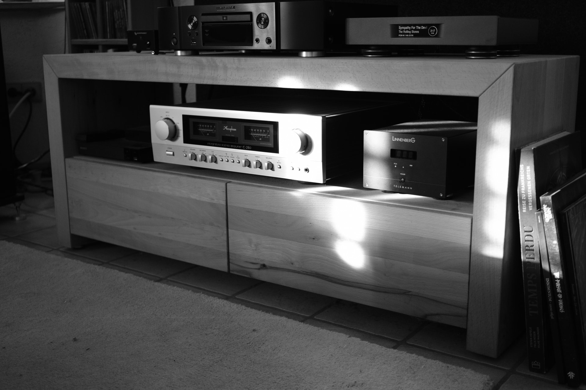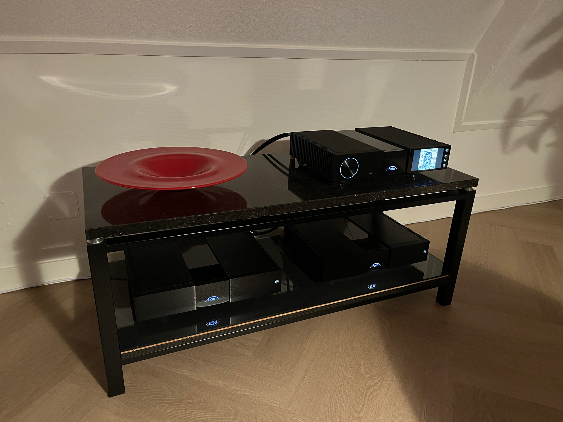 A steel frame with a pretty heavy slab of granite to support the NSC 222 (and in the past my Audiomeca turntable). The bottom shelf was glass only but has been reinforced with a piece birch board and a slab of cork.