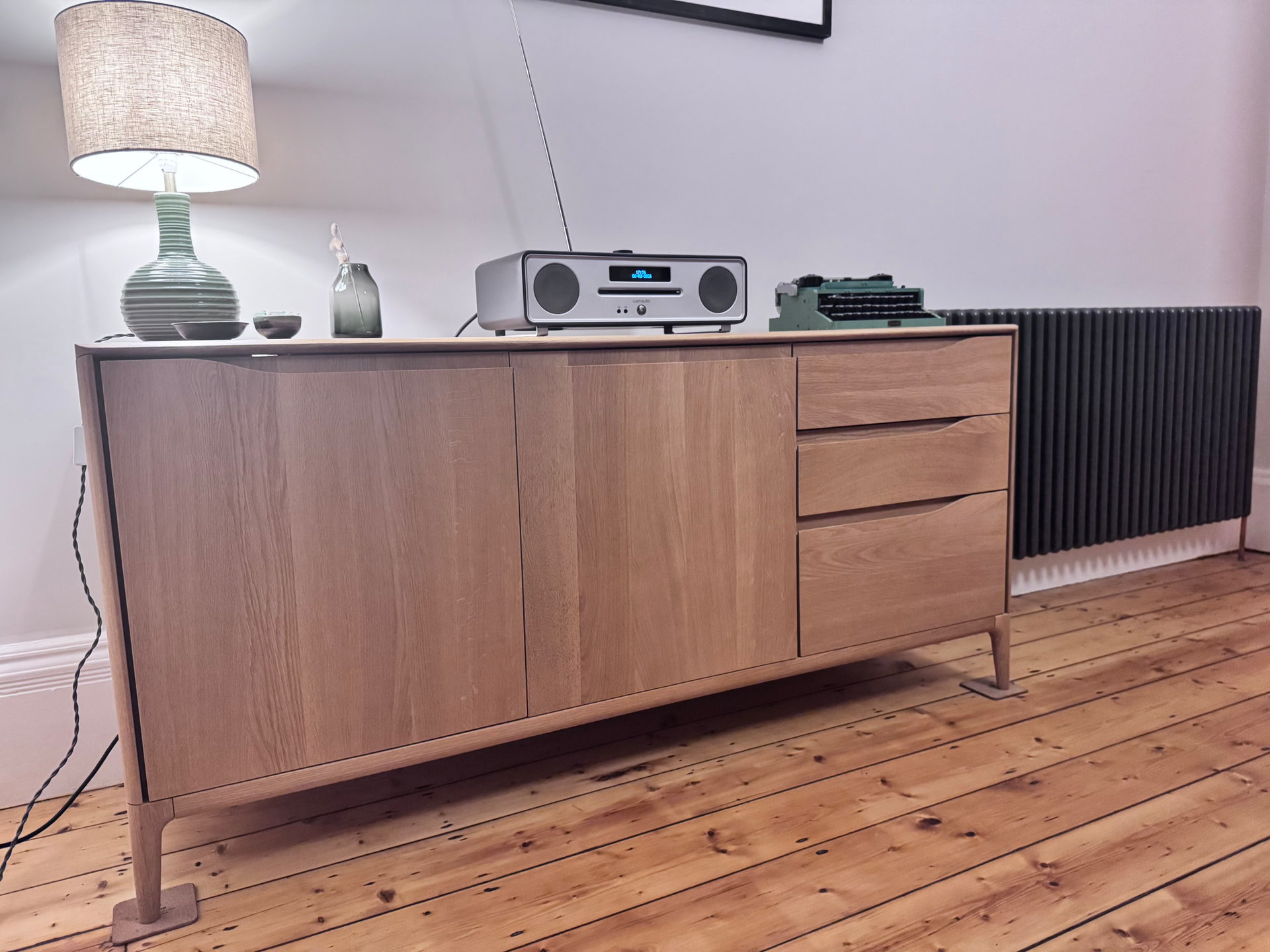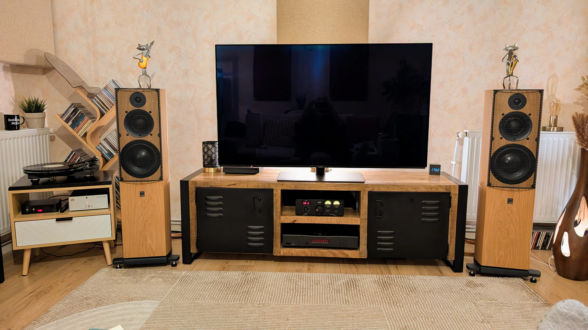 The New Zealand Rimu AV cabinet houses 2 Blu-Ray players and the Heed PS and headphone amp with the 65” OLED TV on top: