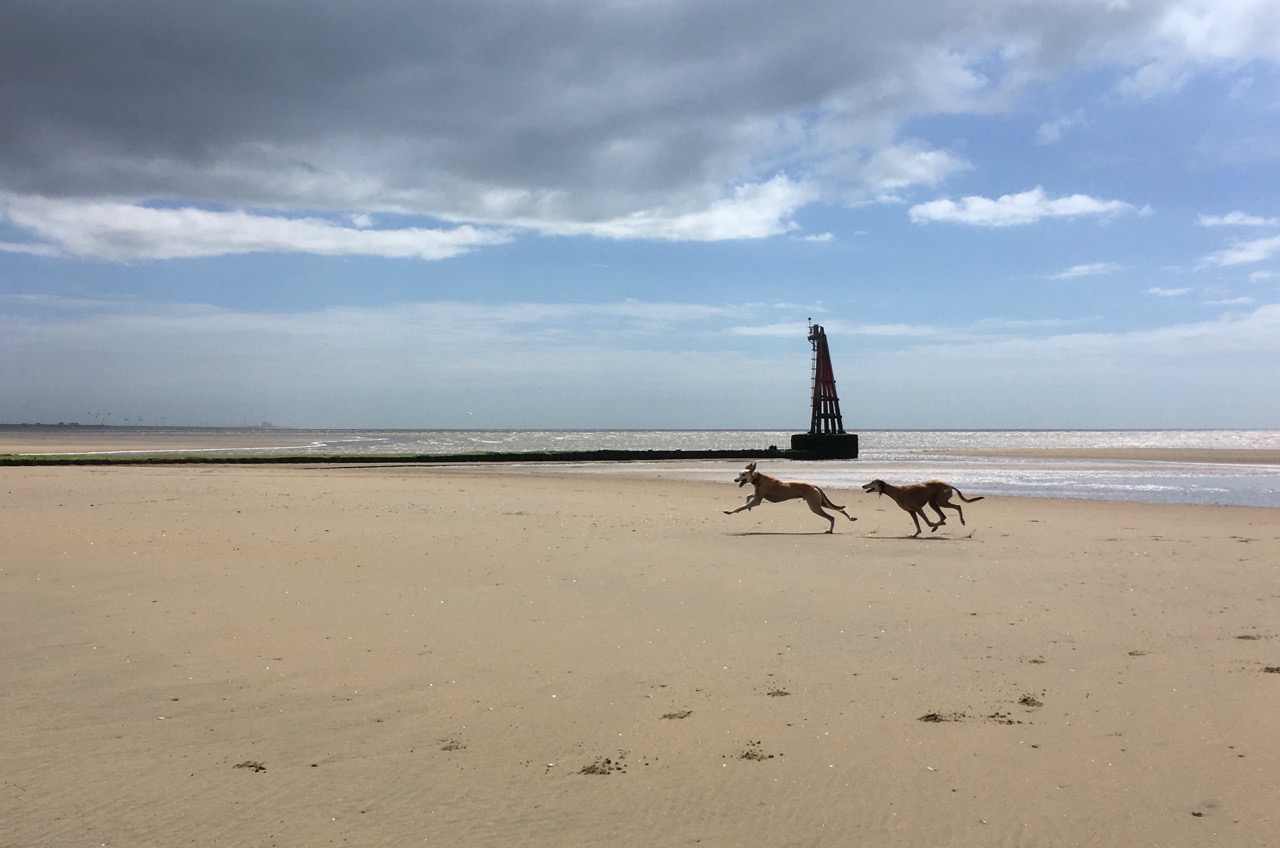 Louby Lou (Jack Russell) with Luna (Lurcher on left) and Twig (Lurcher on right) at their favourite place - the beach at Rye harbour at low tide.