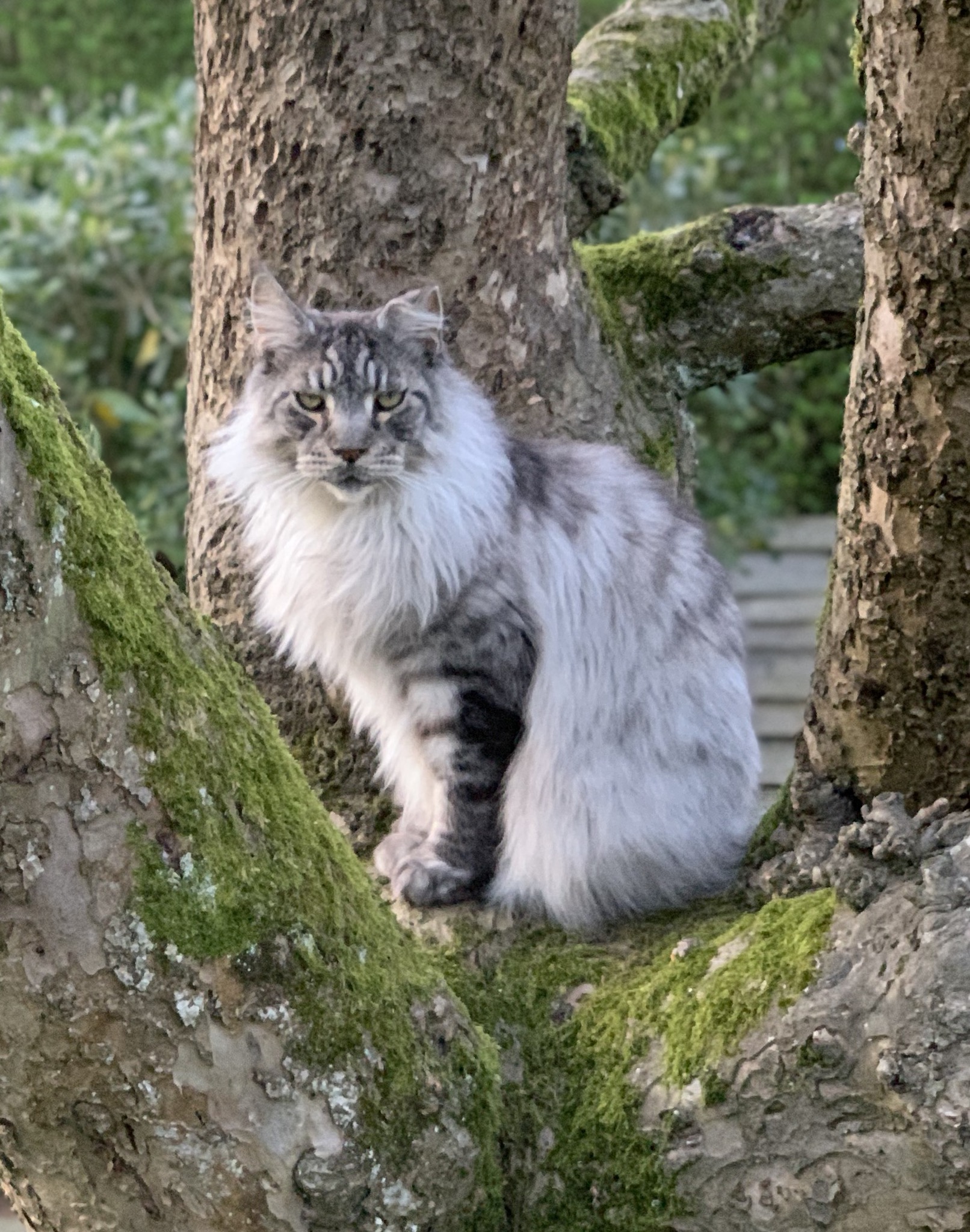And this is Freddie, our other Maine Coon. He is besotted with me for some reason and contrary to Nigel’s comment about what motivates cats (ie food) he likes always to sit on my shoulders or at least as near to me as possible except if he detects any possible vetinary-related intention on my part.This was nice when he was a kitten but because he weighs 7 Kgm now, I try not to encourage it too much.