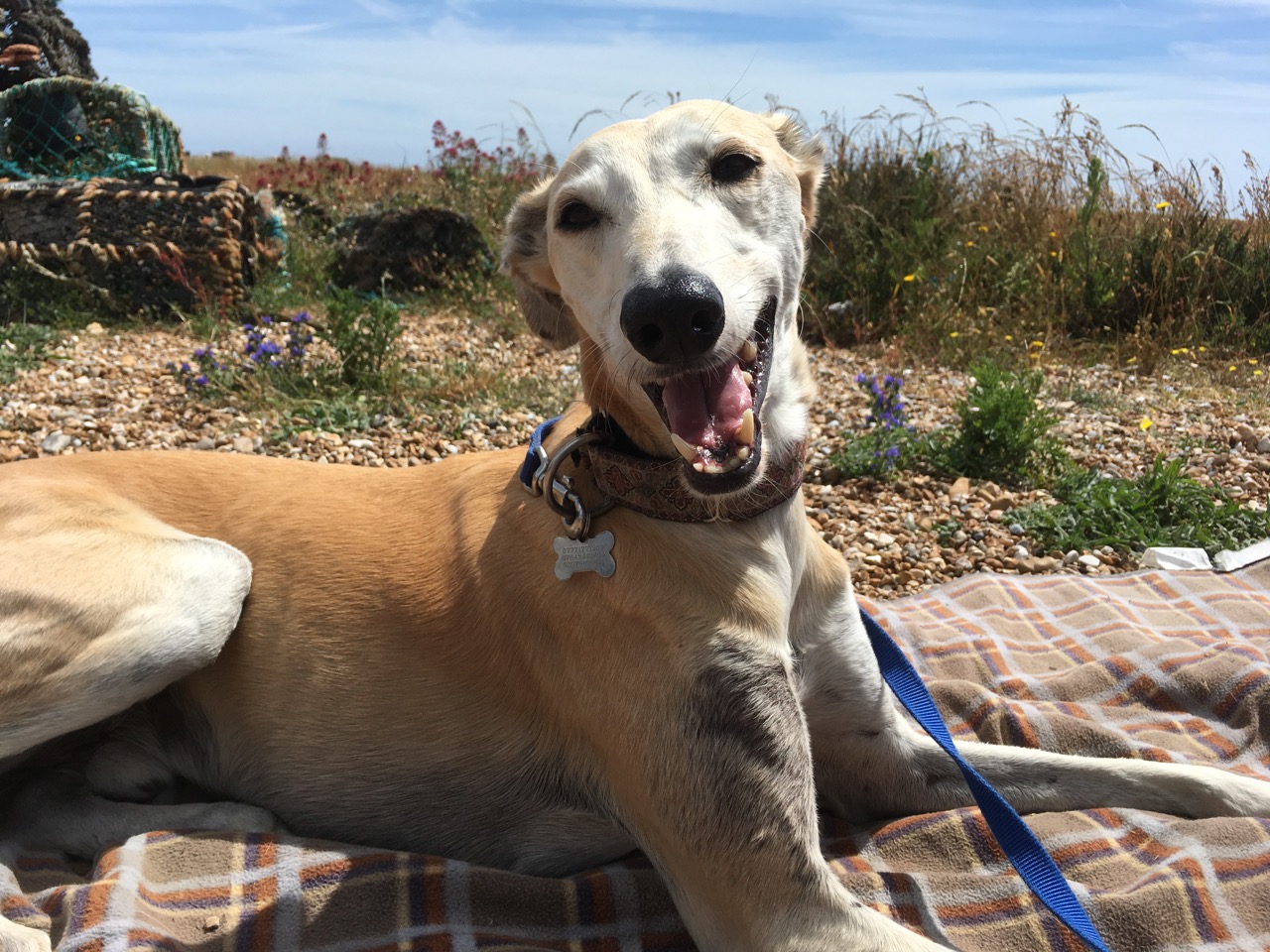Luna is beautiful and moves like a panther, but she’s terrified of pretty much everybody bar D and I. I hate to think what happened to her to make her so frightened and distrustful of people. She’s very hard work as she cannot be left alone, otherwise she panics and become desperate to escape any room. It means she goes with us everywhere. She likes to sit outside on a rug on the lawn and survey the world around her. She also loves to play chase with any other dog who can keep up with her.