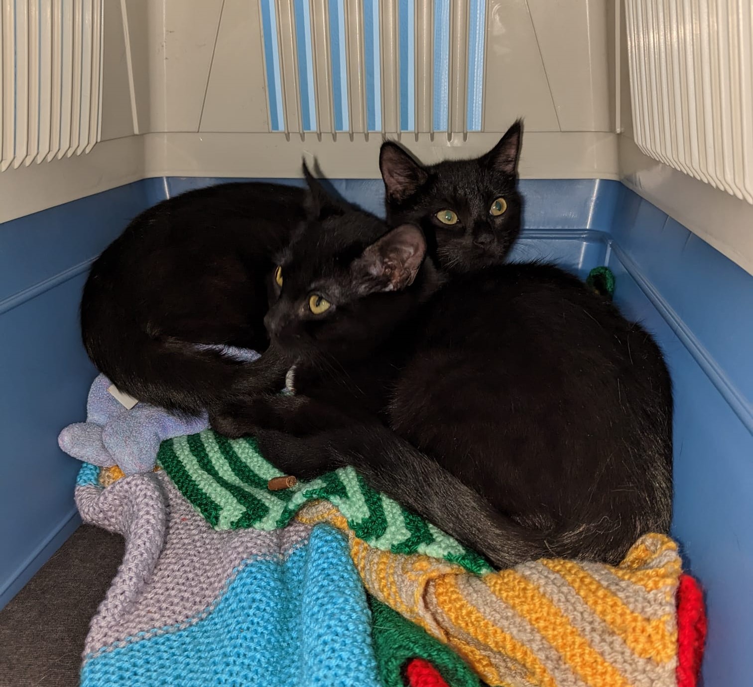 The last pic is the day the feral kittens arrived here, too scared to come out of the basket. Now I have both of them bouncing around on the bed, making sure I wake up in time for their breakfast.