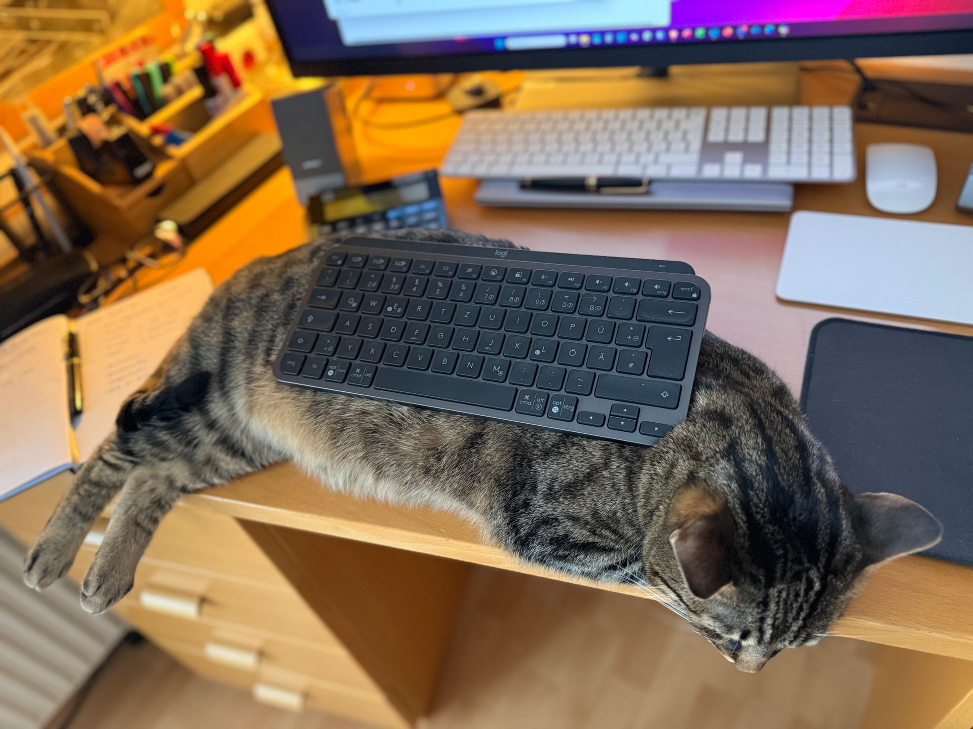 After Louis made my work difficult again today by lying on the keyboard and accidentally calling a bunch of colleagues on Teams, I simply turned the tables on him. He didn’t seem to enjoy it much, though, shortly afterwards, he went off to find a different spot to sleep.