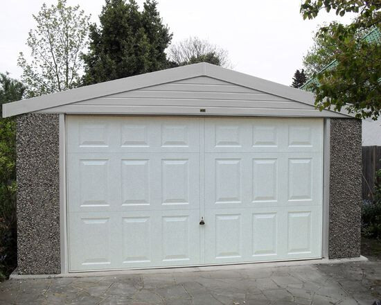 Down the end of the garden we have modern a Comptons sectional garage. This is like the Marley garages of old with reinforced concrete walls bolted together on a concrete base. It has a steel A frame roof with concrete roof pitched at an ideal angle. The garage is 28ft long and 14ft wide so there’s quite a lot of roof area available.