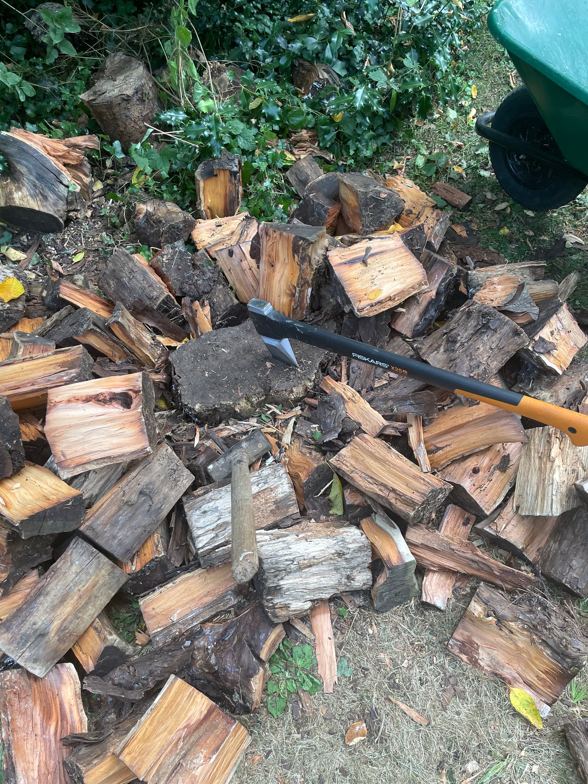 The sledge hammer is to deal with logs that the axe doesn’t chop through. The axe is about 2.5kg with a carbon fibre handle. The handle is a little shorter than I like so the logs are placed on a chopping block so there is something to stop the axe. I’m trying to avoid my legs doing that job!