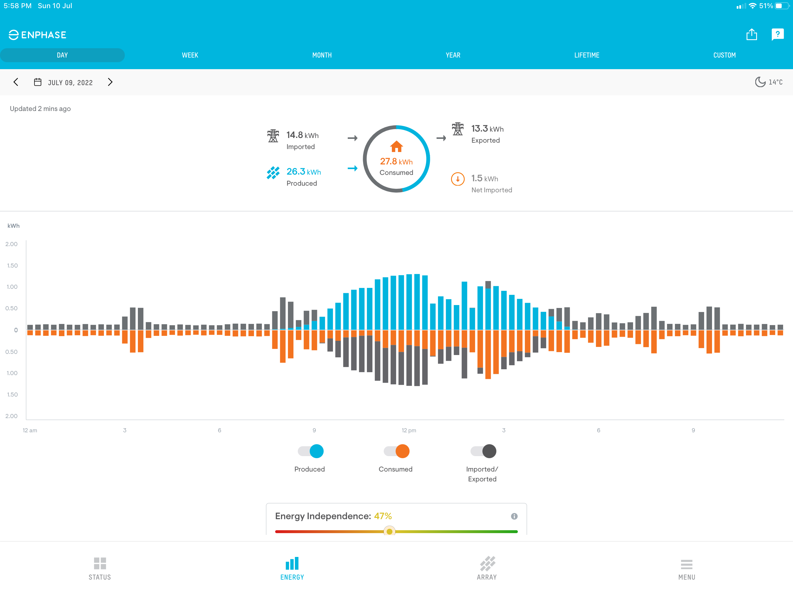 My consumption today is 14.9kw of which 12kw is from my roof, despite not much sun. I have also run completely off the sun during peak demand periods, due to my battery storage.