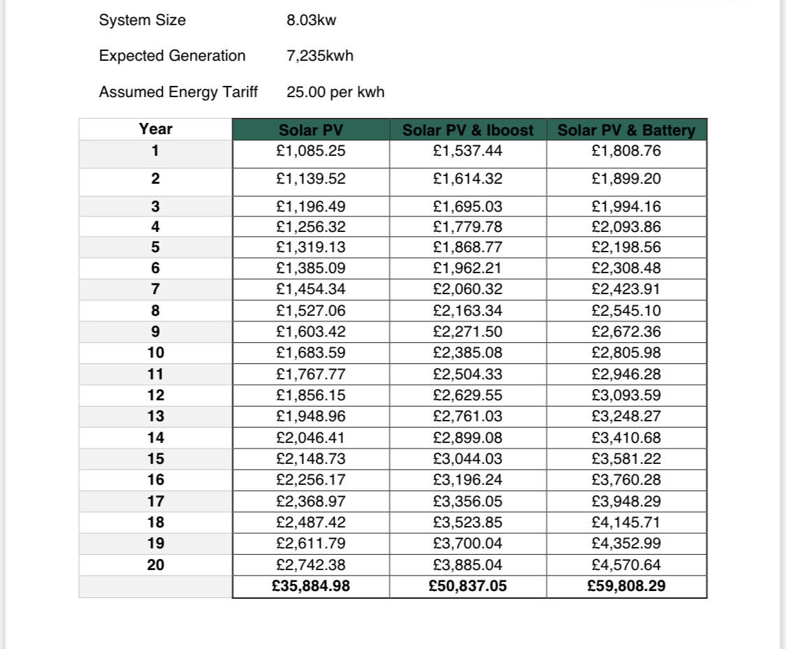 The info they gave me at the time suggested that the payback period (for both) was about 7 years, at an assumed tariff of 25p kWh with a 5% annual increase. Obviously with the price increase we’ve had (and the further ones expected) I’d expect that pay back period to be reduced.