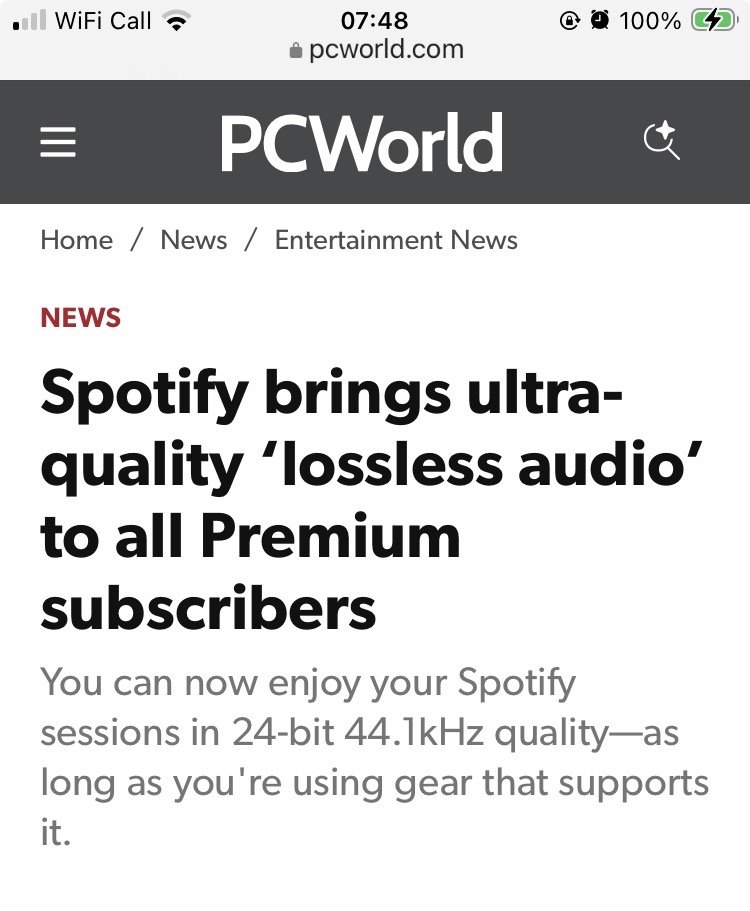 Headline reads “ Spotify brings ultra-quality ‘lossless audio’ to all Premium subscribers”
