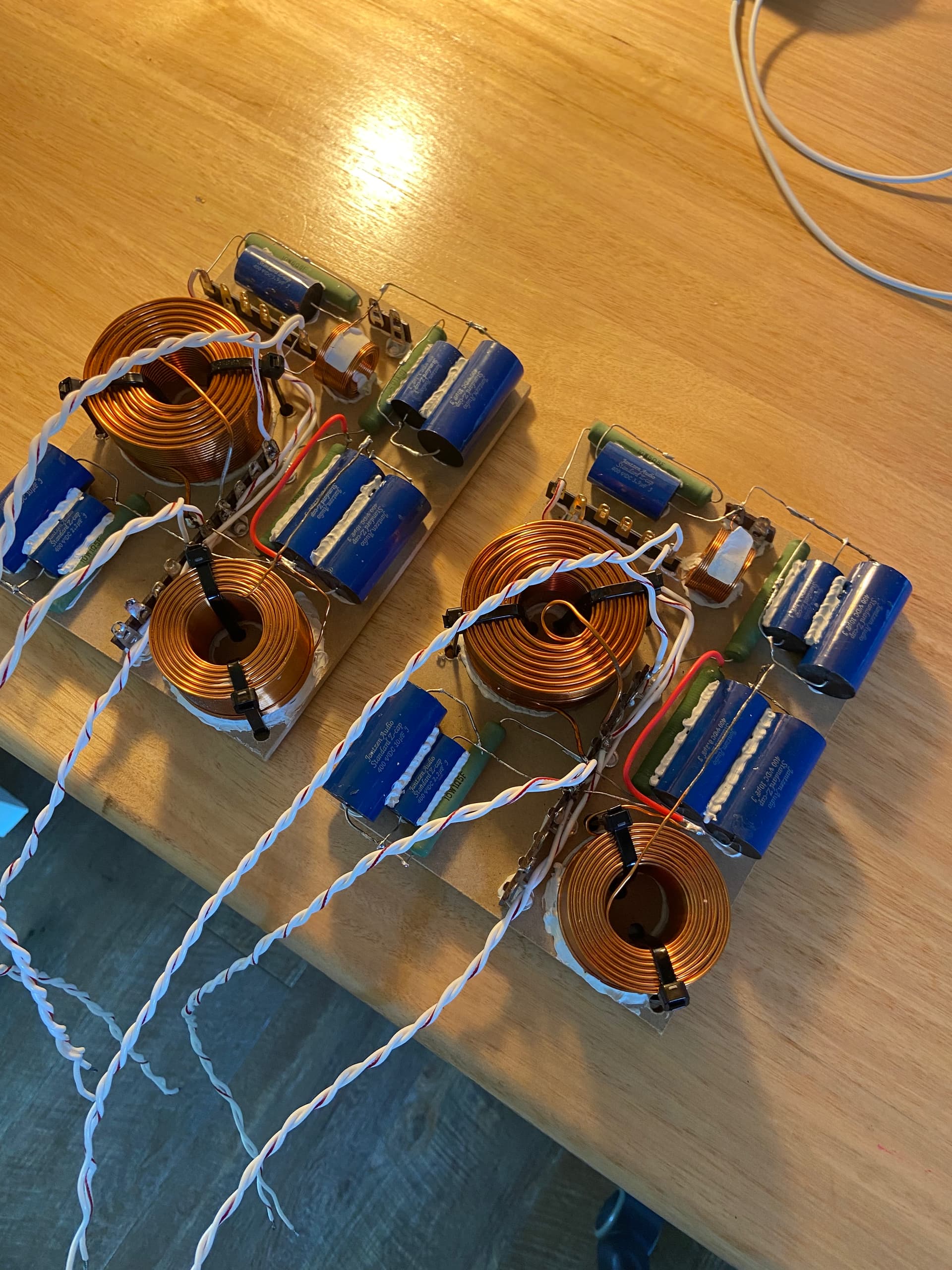 Apologies for thread drift. Here’s a few pics to make up. Remaking my old bookshelf speakers using some veneer I have left from the big speakers. An old Troels Gravesen design using scan Speak drivers. Currently getting veneered in Maple. Crossovers ready to go. (Wiring these is my absolute favourite part of making speakers)