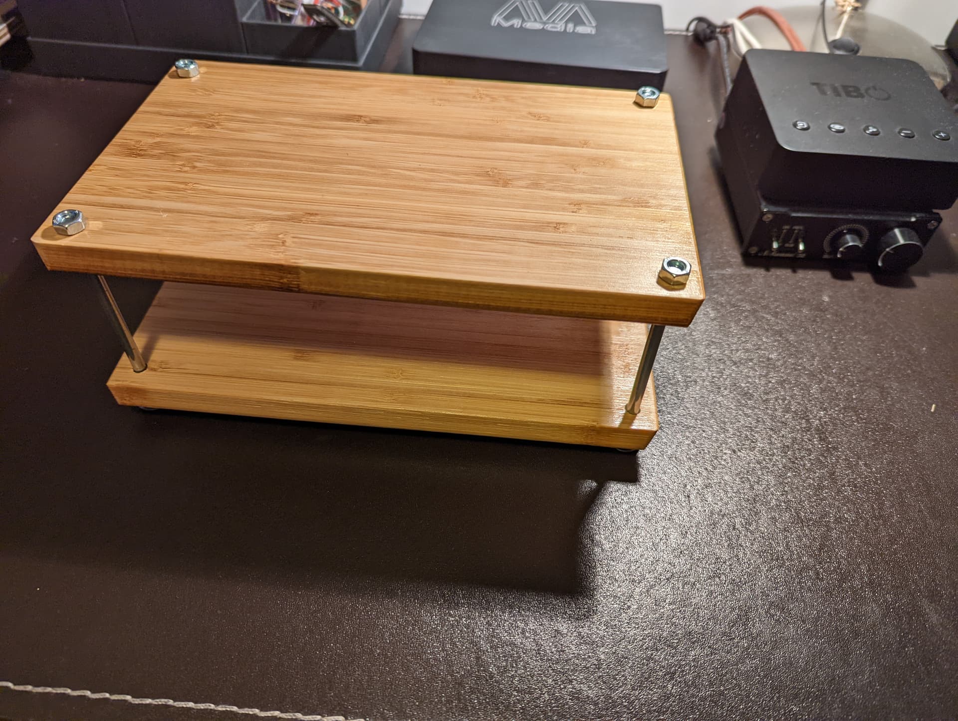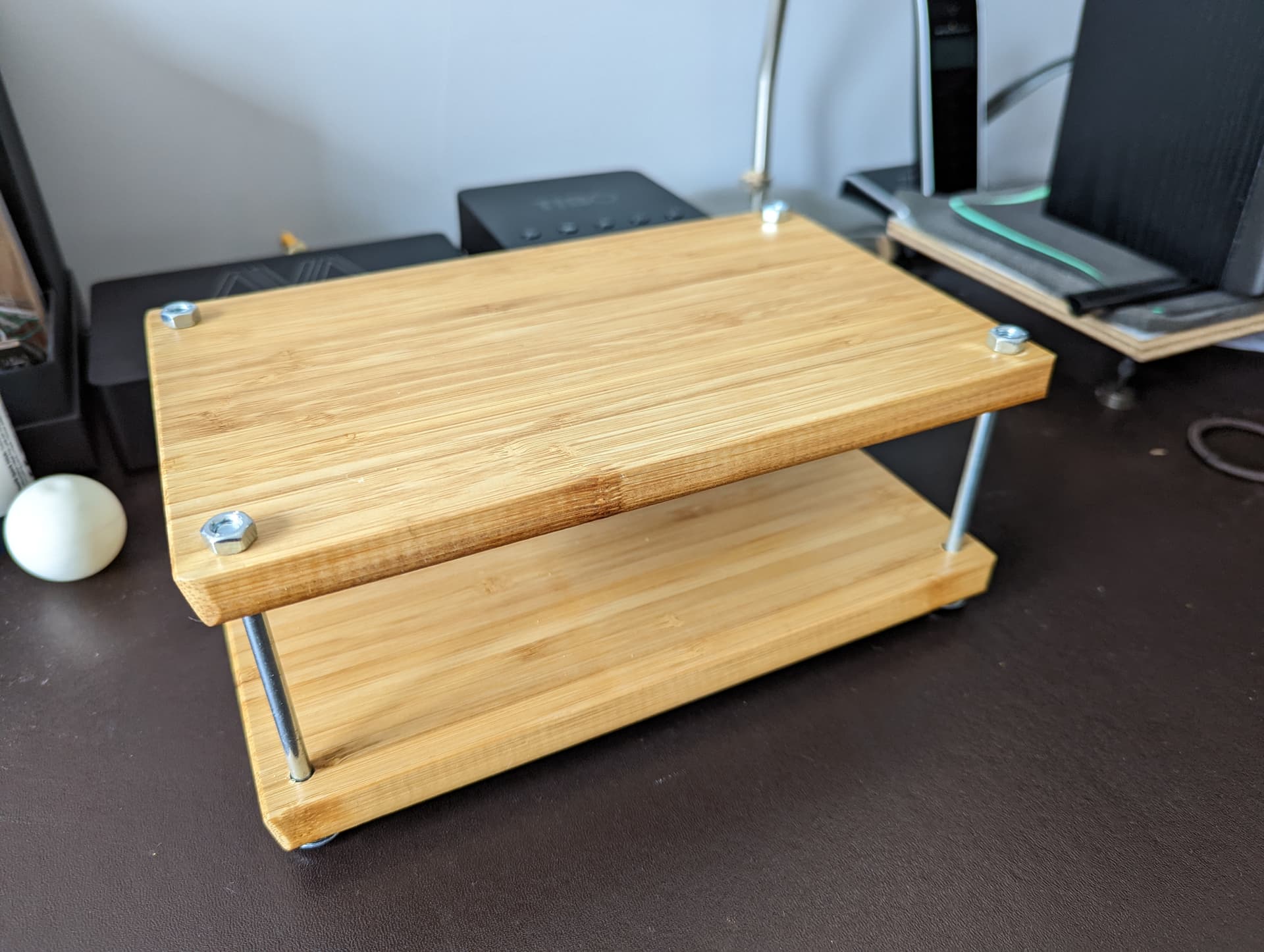 We used two of the smallest IKEA Aptitlig Bamboo chopping boards, a pack of partially treaded 100mm bolts from B&Q and some rubber grommets for ‘isolation’.