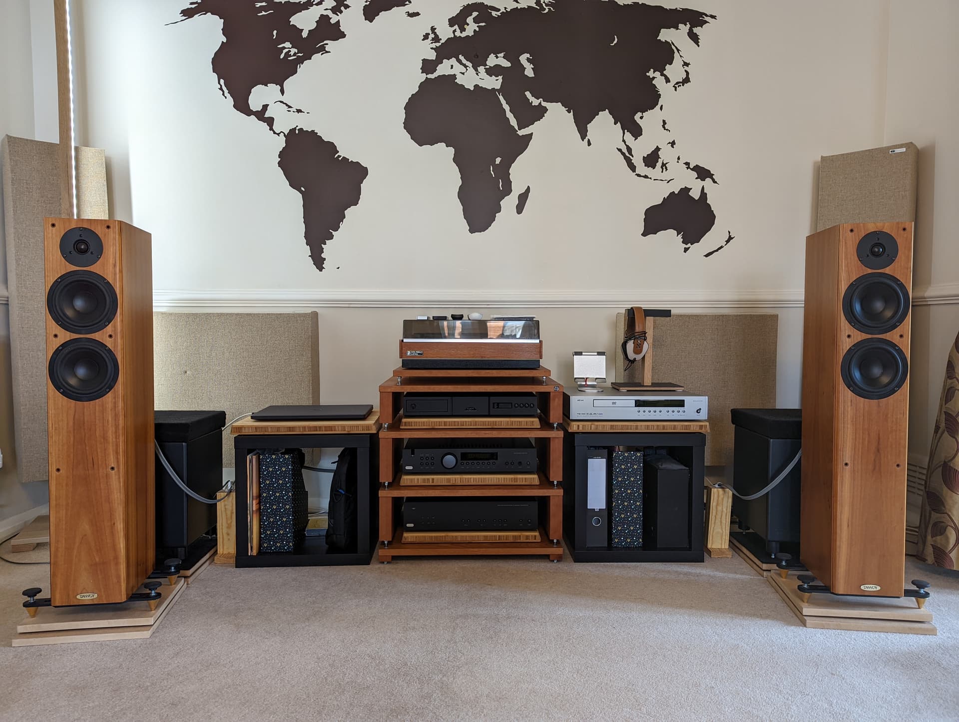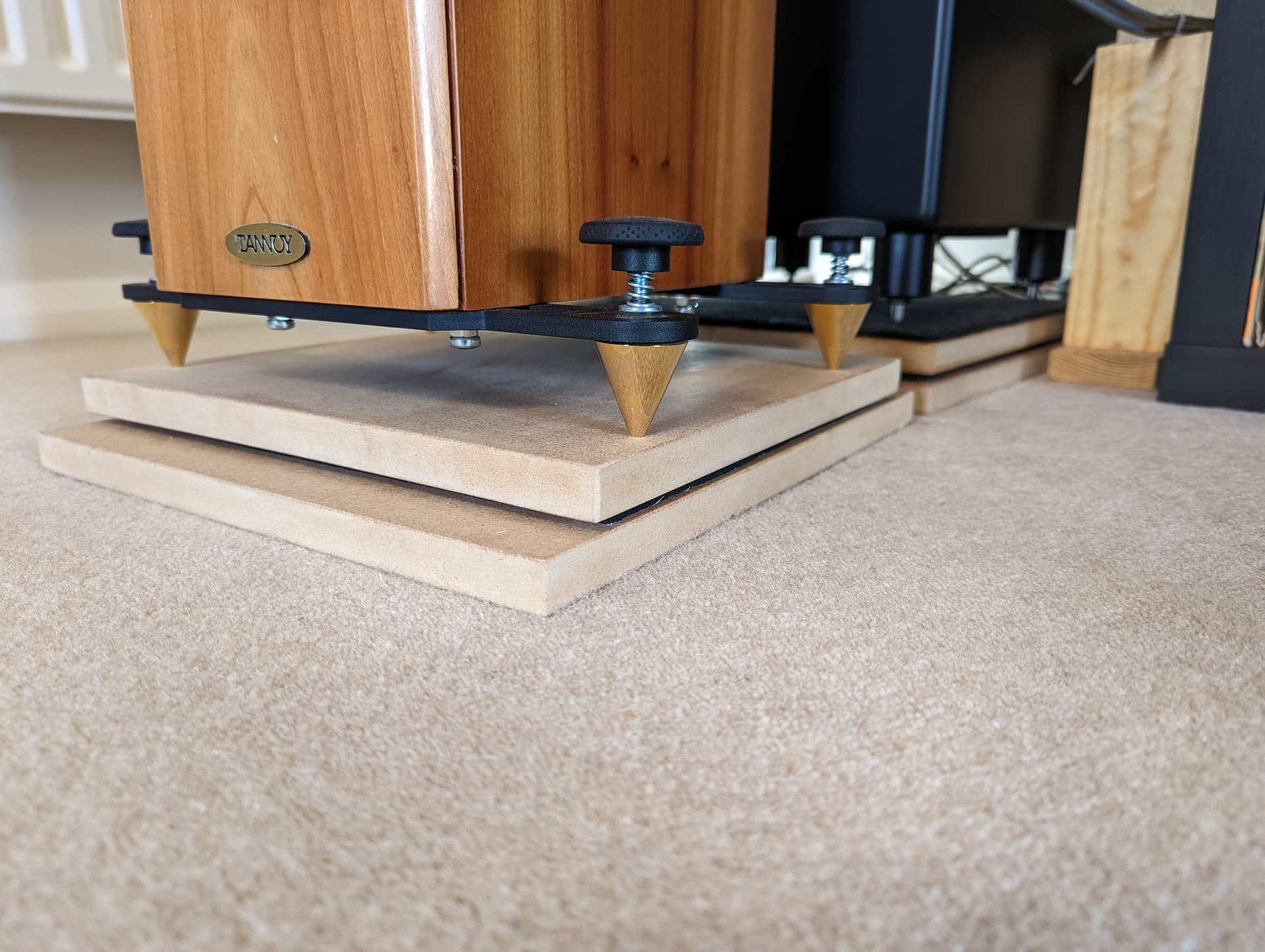 I have also made some plinths for the main speakers from 2 layers of 18mm MDF with 6mm closed cell foam sandwiched in between - the boards are then screwed together from underneath. I drilled 5mm holes in the top board to seat/ couple each spike. The positioning of each speaker is now much easier as the MDF slides over the carpet. Speakers are more stable and SQ has improved too. I just need to decide how best the seal/finish the MDF now without changing the colour much. Suggestions will be appreciated.