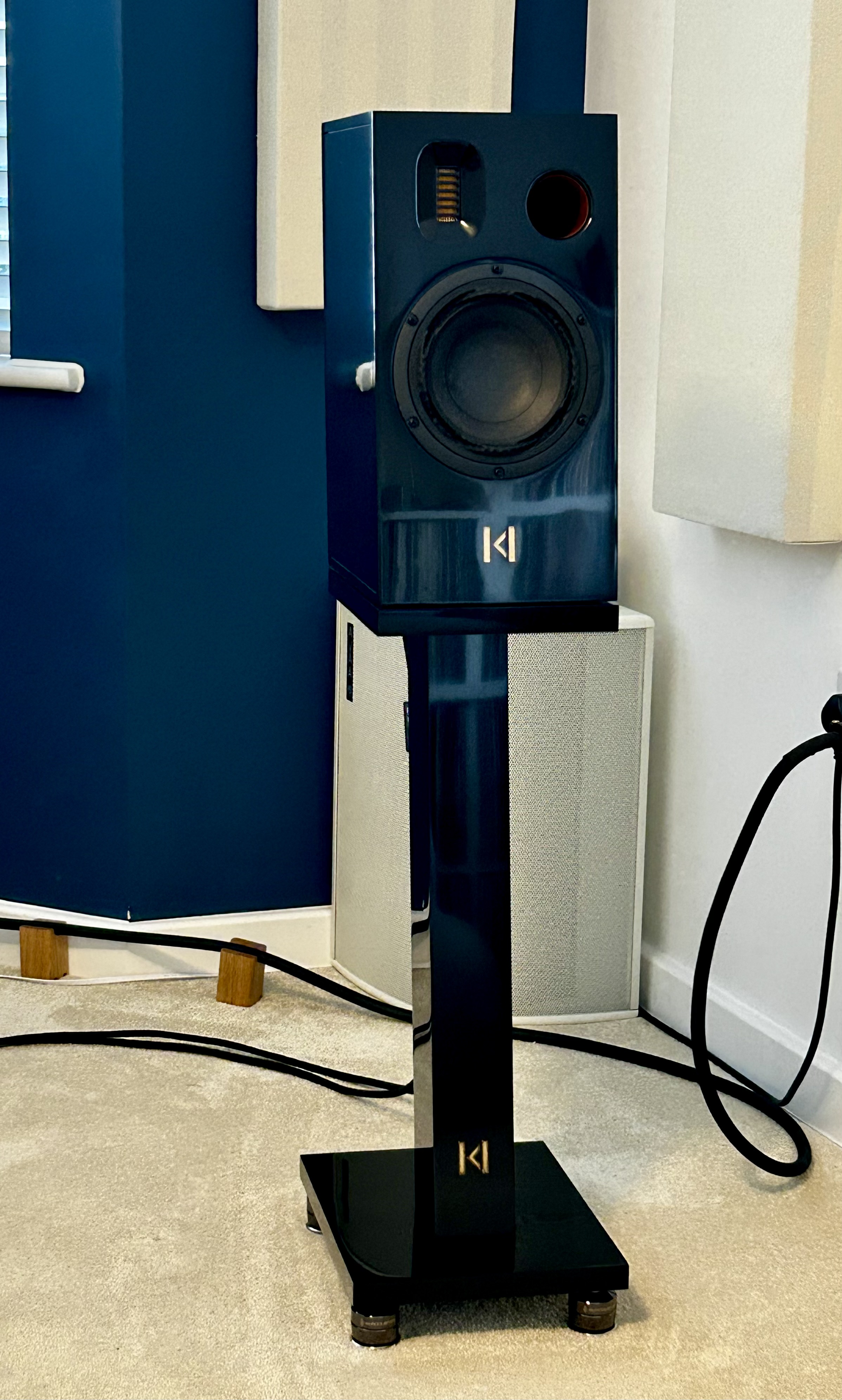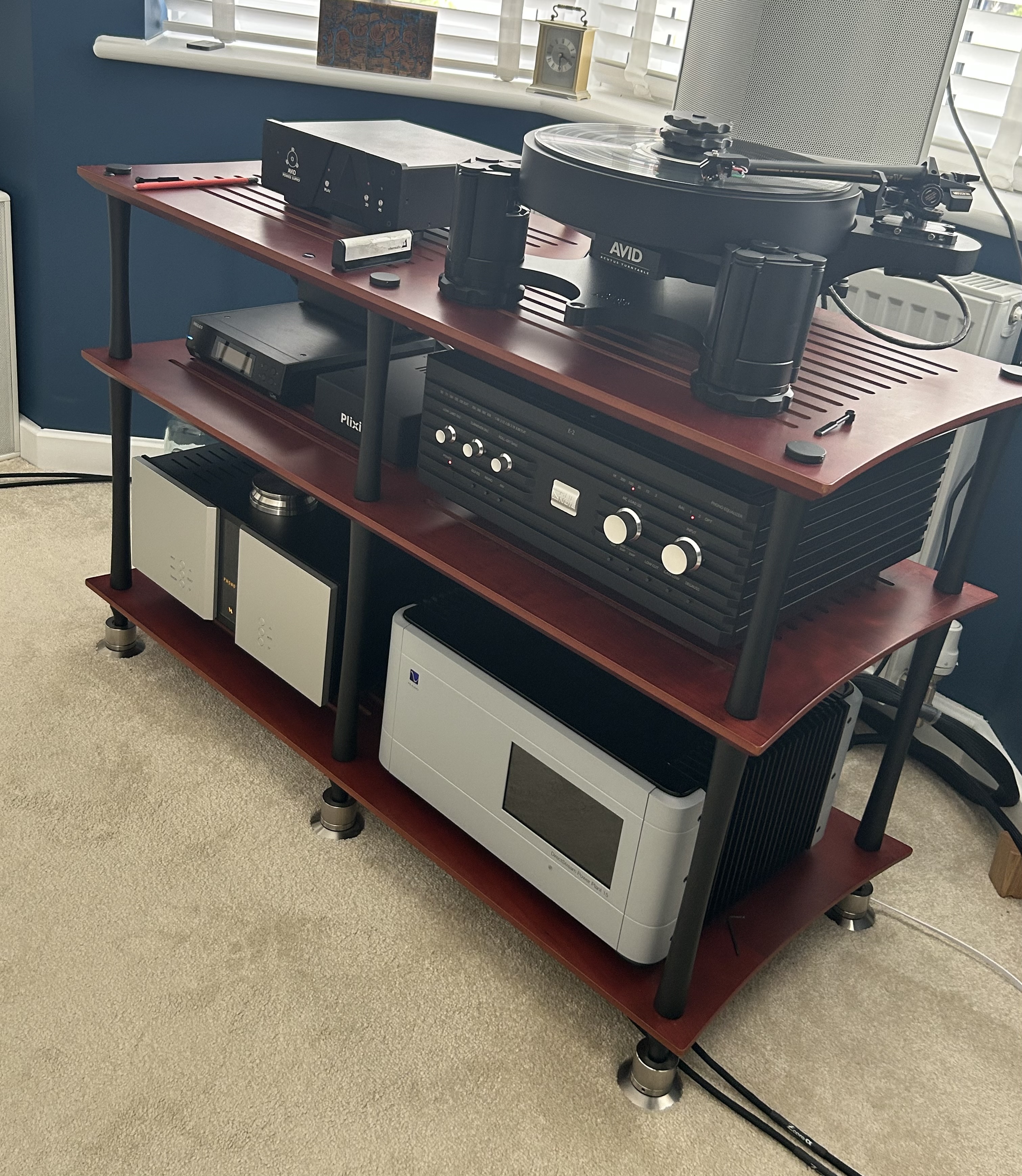 Latest system pics showing the latest upgrade. The dedicated KA stands for the Mimi speakers. I honestly didn’t believe that stands made much of a difference as long as they were rigid and well anchored. Then these arrived. They are made of a material called Krion, are not terribly heavy, incorporate panzerholtz wood in the top plate and wobble courtesy of the IsoAcoustics footers. They are also stupidly expensive and cost more finished in black.