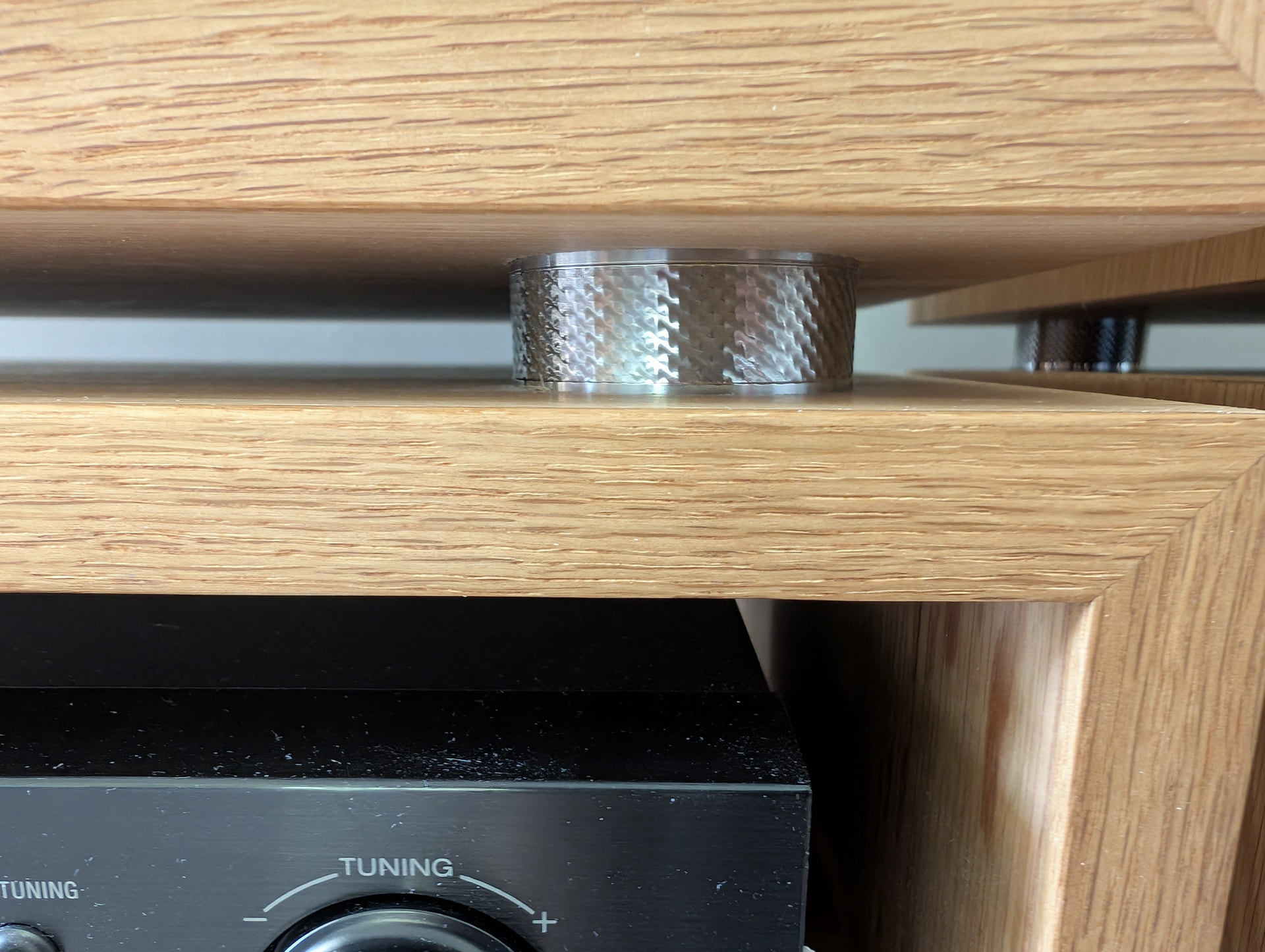 The spacers between the cabinets started life as stainless steel tube. The facets on them are CNC-milled. Similarly, the discs on the top cabinet in each stack are slices of stainless steel rod with a criss-cross pattern milled into them.