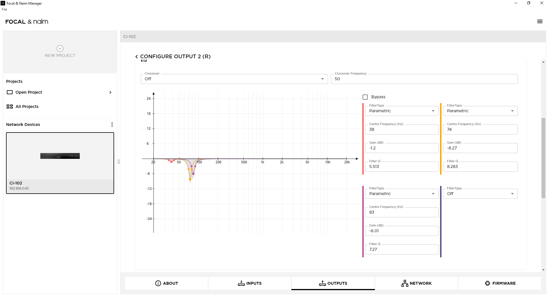 Here are two images from the relevant control windows in the Focal-Naim Manager EQ Software where I am able to set the relevant filter parameters.