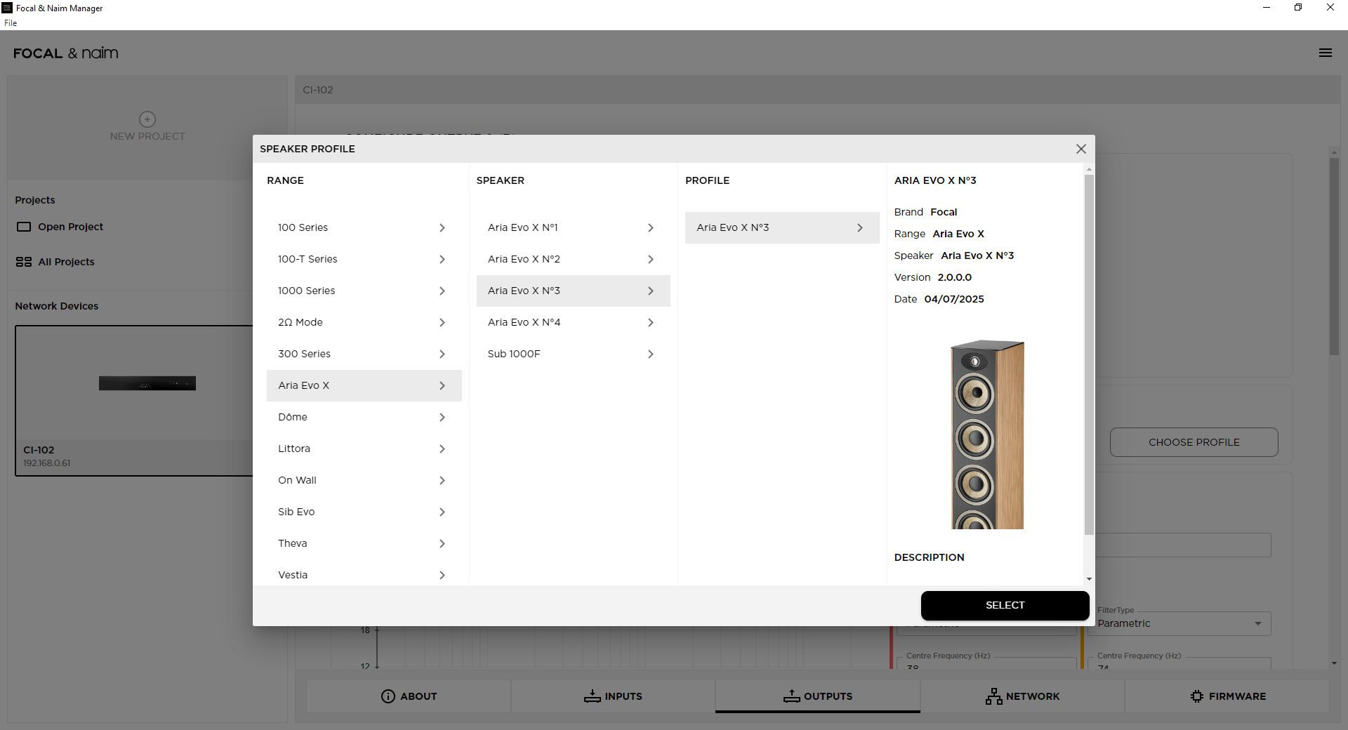 Special Notes: Linn SO only facilitates corrections below 100Hz. There are good technical reasons for this to do with human hearing. Naim EQ facilitates corrections over the whole audio bandwidth - which is similar to many other DSP based EQ audio products. The limitations in the Naim CI-102 EQ are that a maximum of four separate filters are allowed, with an additional crossover setting if one wished to use that. The other ‘feature’ of the Focal-Naim software is that it has pre-coded corrections for all the Focal loudspeakers (see example selection window below)! Not particularly useful if one has Magico or Kudos or Neat loudspeakers etc etc…