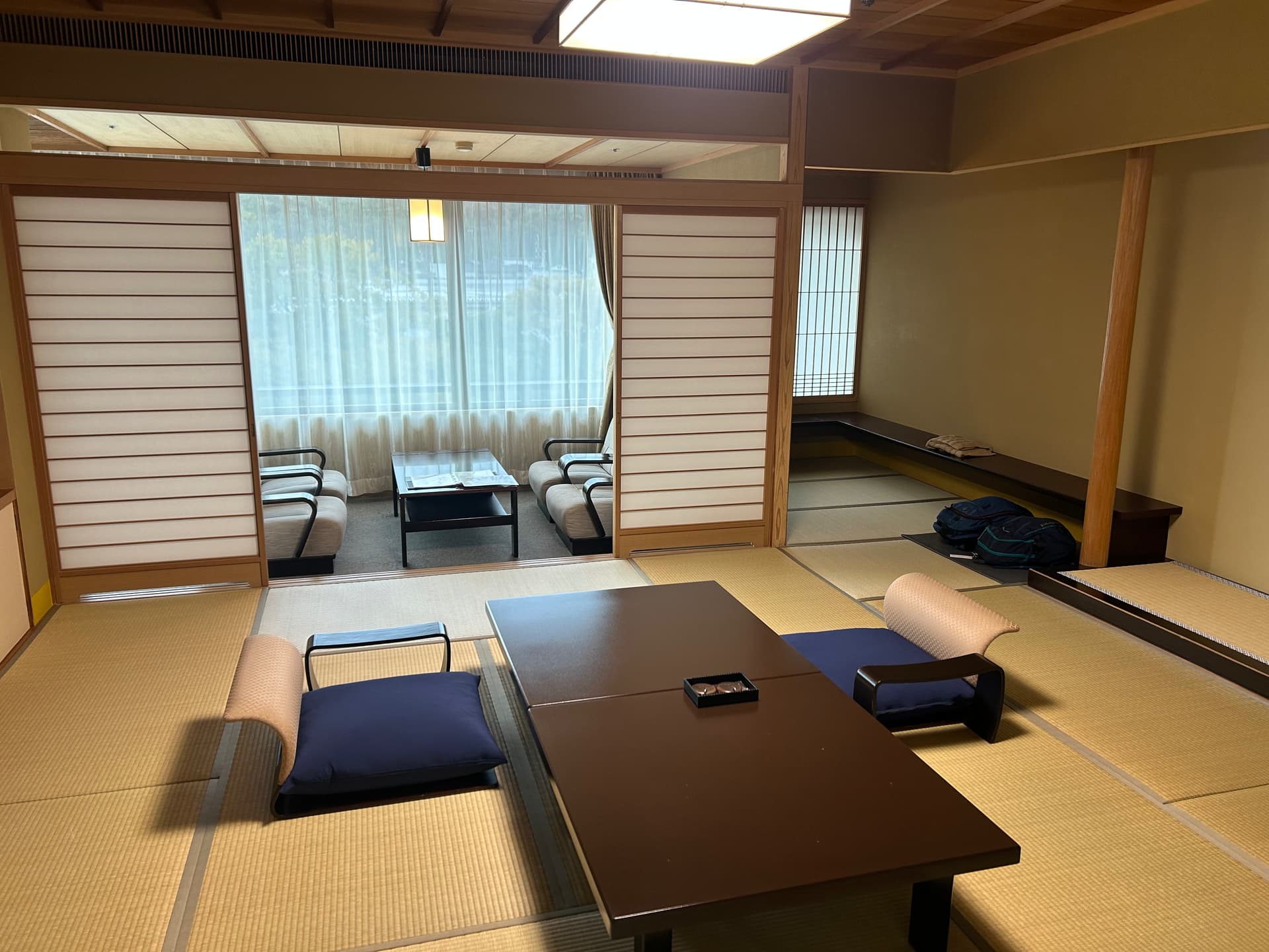 It has on onsen on the second floor but also an open air one on the very top floor where you can sit in the hot spring bath looking out over the valley. I went there yesterday afternoon and also at 7 am this morning where I had it to myself - very special. Our traditional riyokan room where they remove the tables and set up futons while you are having dinner