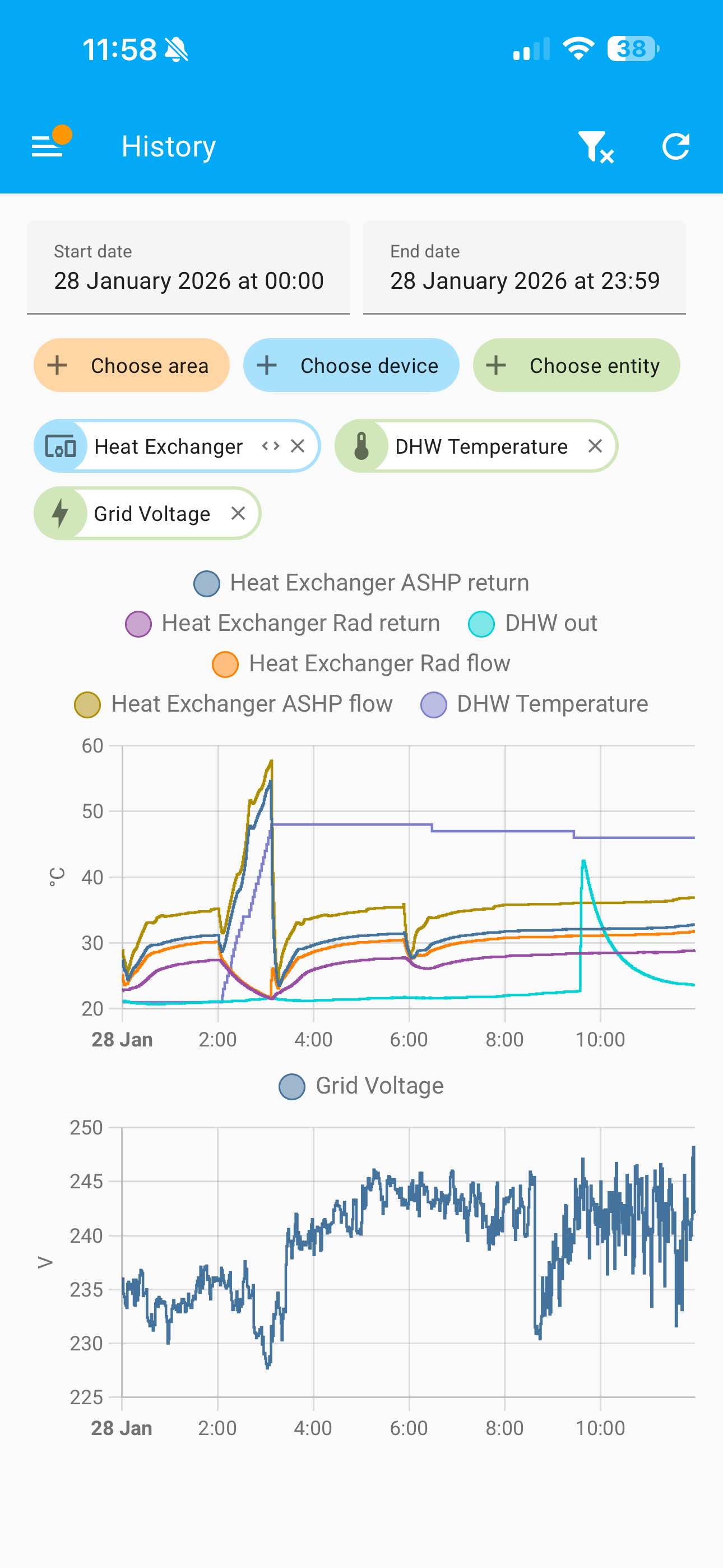 Today started quite cold so I have run beyond 10am using some solar. The ASHP has run continuously for 6 hours (very efficient) and the lounge has continued warming.