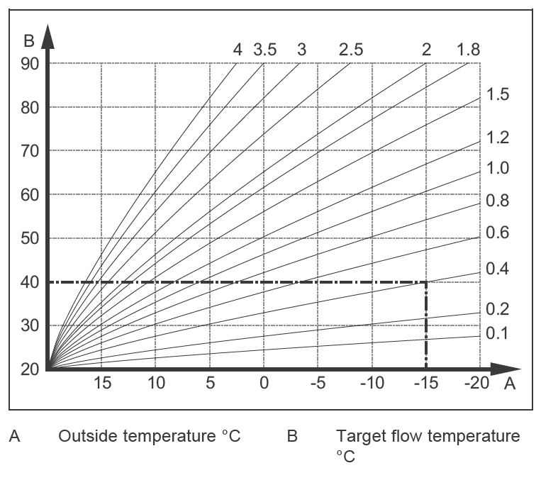 When using pure weather compensation, which we are, with room temp mod inactive, everything is controlled by a table of flow temperatures that’s stored in the heat pump. Flow temperature increases as external temperature decreases, and also increases as the target internal temperature is increased. So if the temperature outside is say 5°, the flow temperature will be higher if the set internal temperature is 20° than if it’s 16°. With room temp mod off, the system pays no regard to the actual internal temperature. If it gets too hot you lower the heat curve and vice versa.