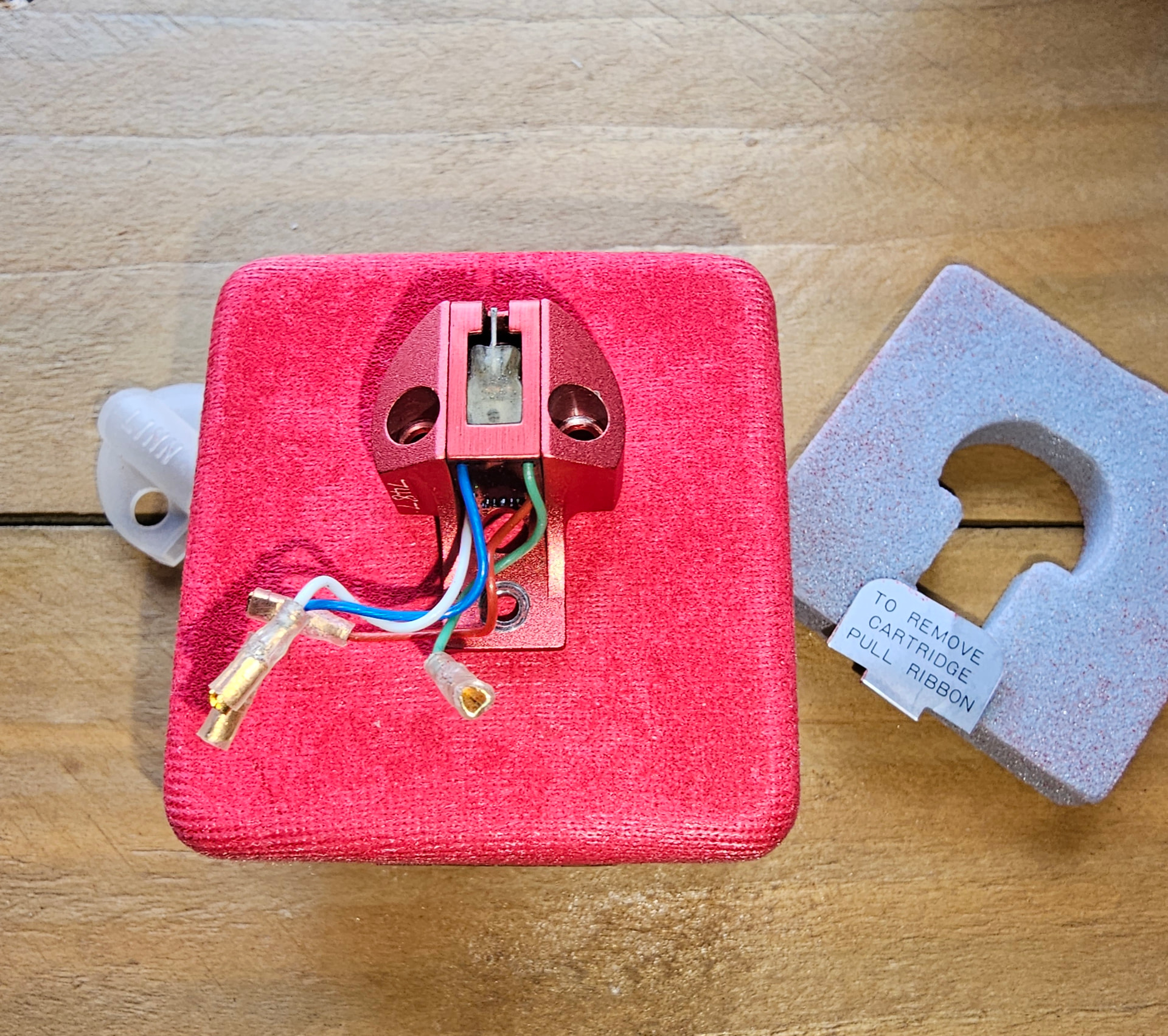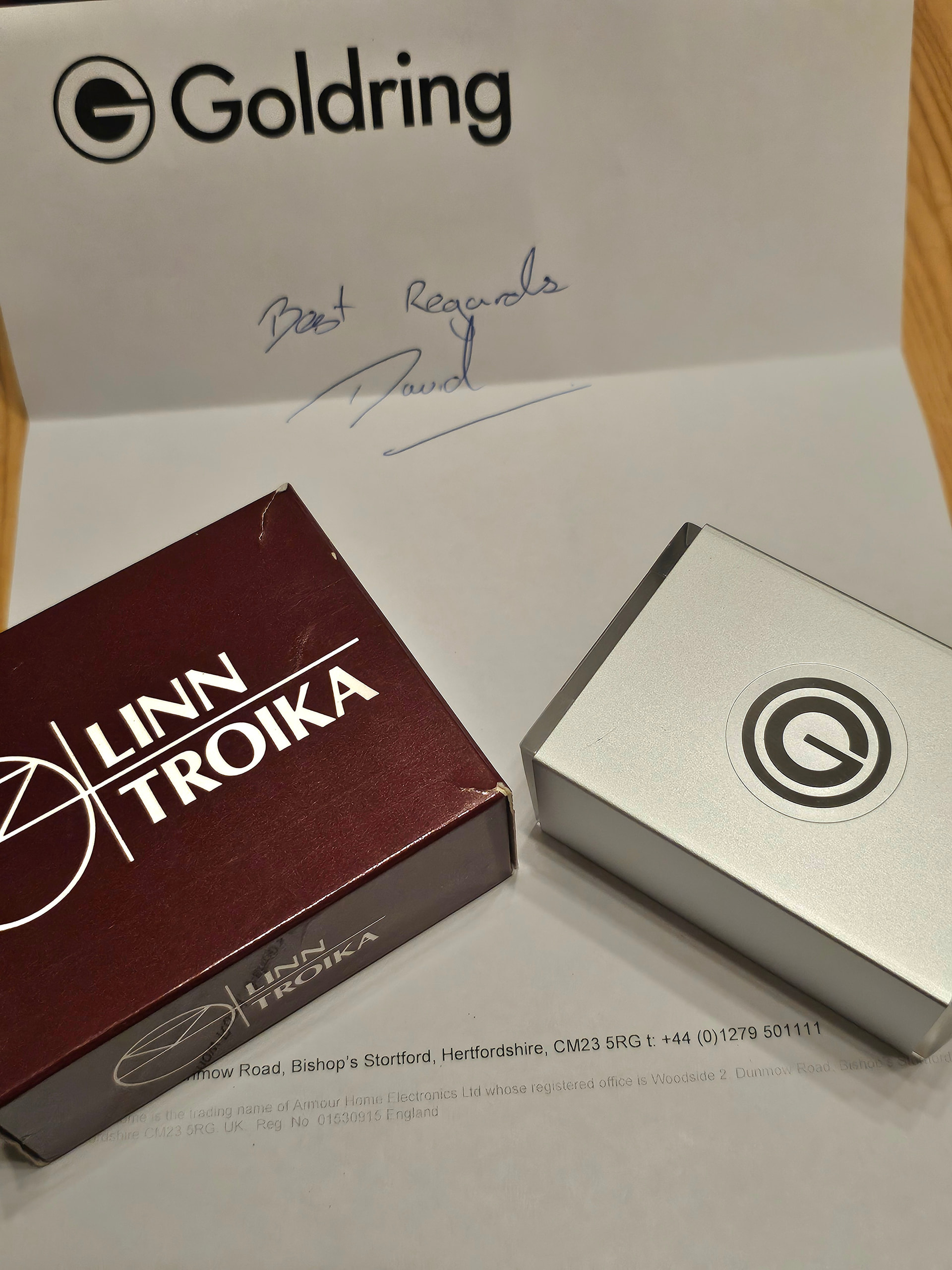 Beautifully protectively packaged; original box, Linn guard and screws all sent back with a lovely Goldring box containing this little jewel. And a nice handwritten note from David. I’m chuffed. Beautiful work.