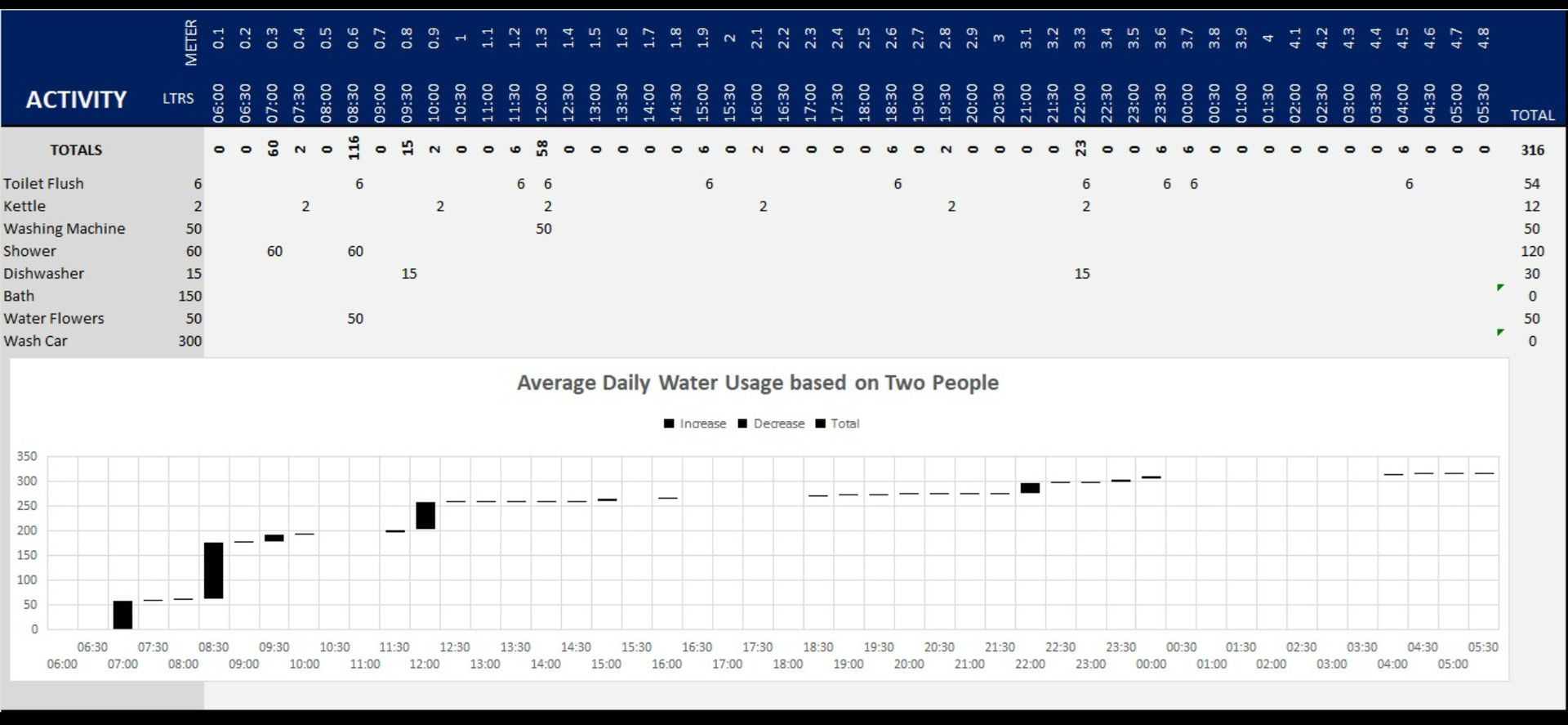 If you are spreadsheet literate you’d have 30min time intervals for 24hrs on the X axis with meter readings and on the Y axis you’d have activity list and LTR’s used. This would paint a very impressive picture that might help strengthen your case with the current supplier.