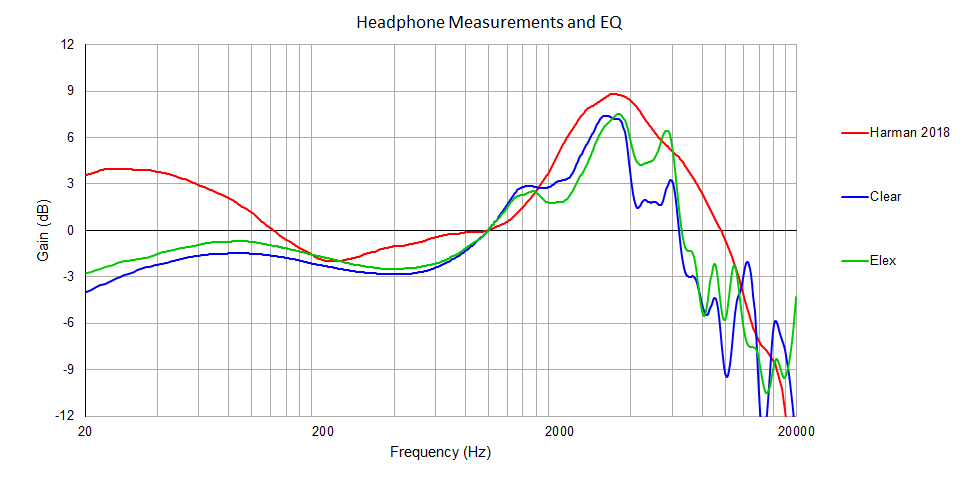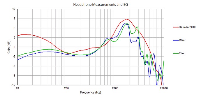The curves are headphone response measurements for the Focal Clear and Elex, compared to the Harman curve. The Harman curve is what we as humans generally find most ‘pleasant’ to listen to.
