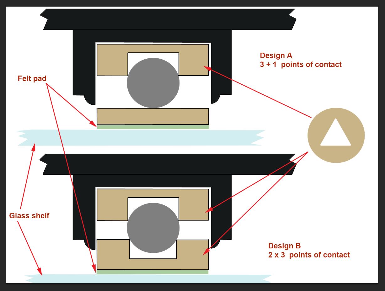 Don’t forget that if you are planning to use 4 supports you’ll need a very precise way of adjusting them for even pressure. The felt layer will defeat the object of using the brass & silicon nitride as it behaves as a visco-elastic interface.