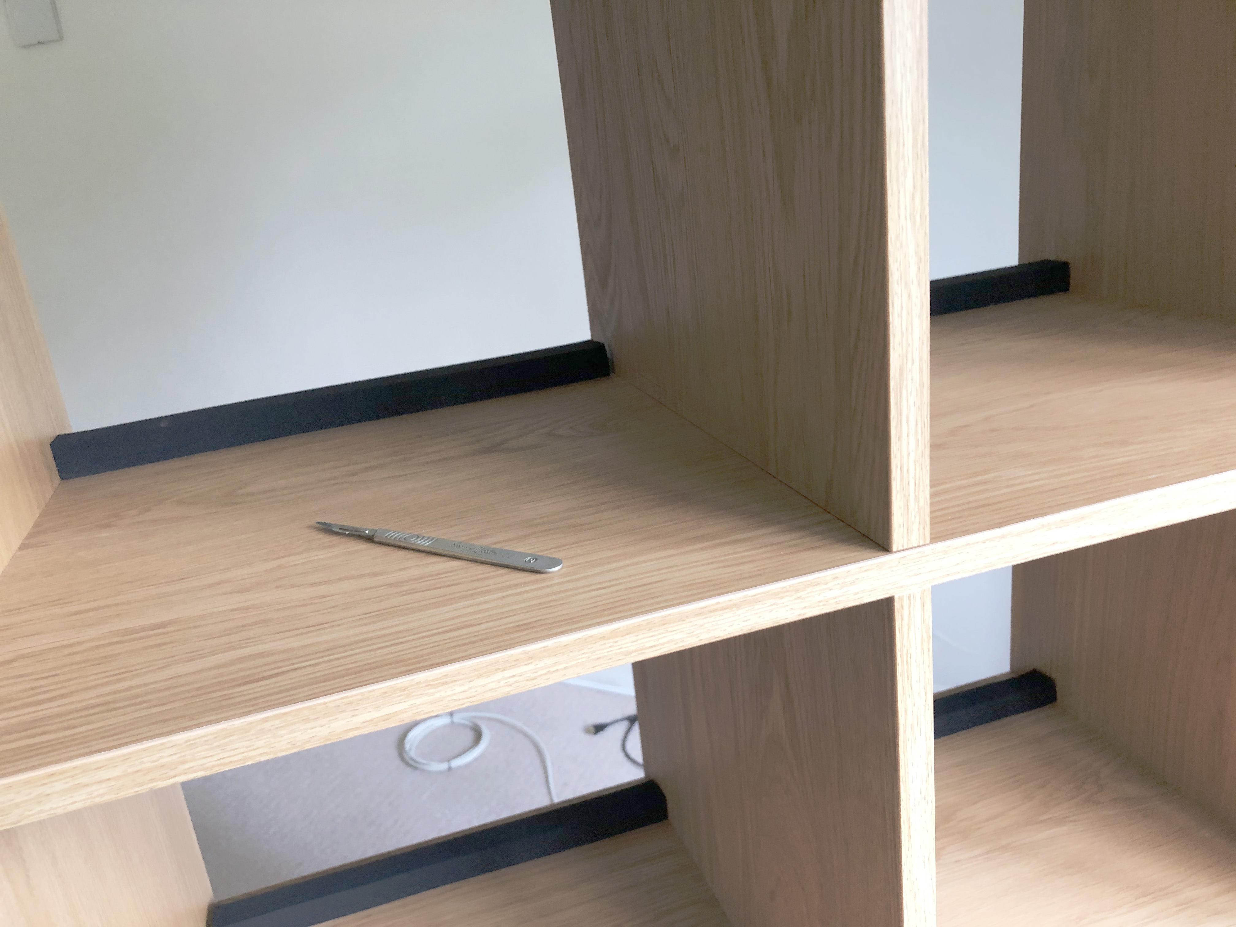 I had considered timber battons, but after a bit of Google noodling I came across this great idea. 2cm thick black self adhesive foam insulation strips bought from Amazon. It’s only about £15 for 4m and comes in two 2m rolls. Each roll fits 6 of the Kallax holes. I thought I’d share this as it’s so neat and easy to fit.