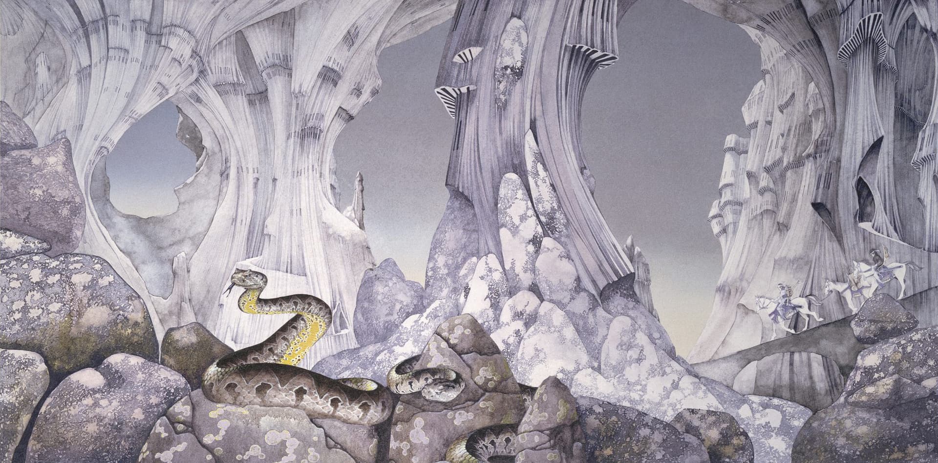 This is the full Roger Dean artwork as if the gatefold were opened fully and the Yes logo removed.