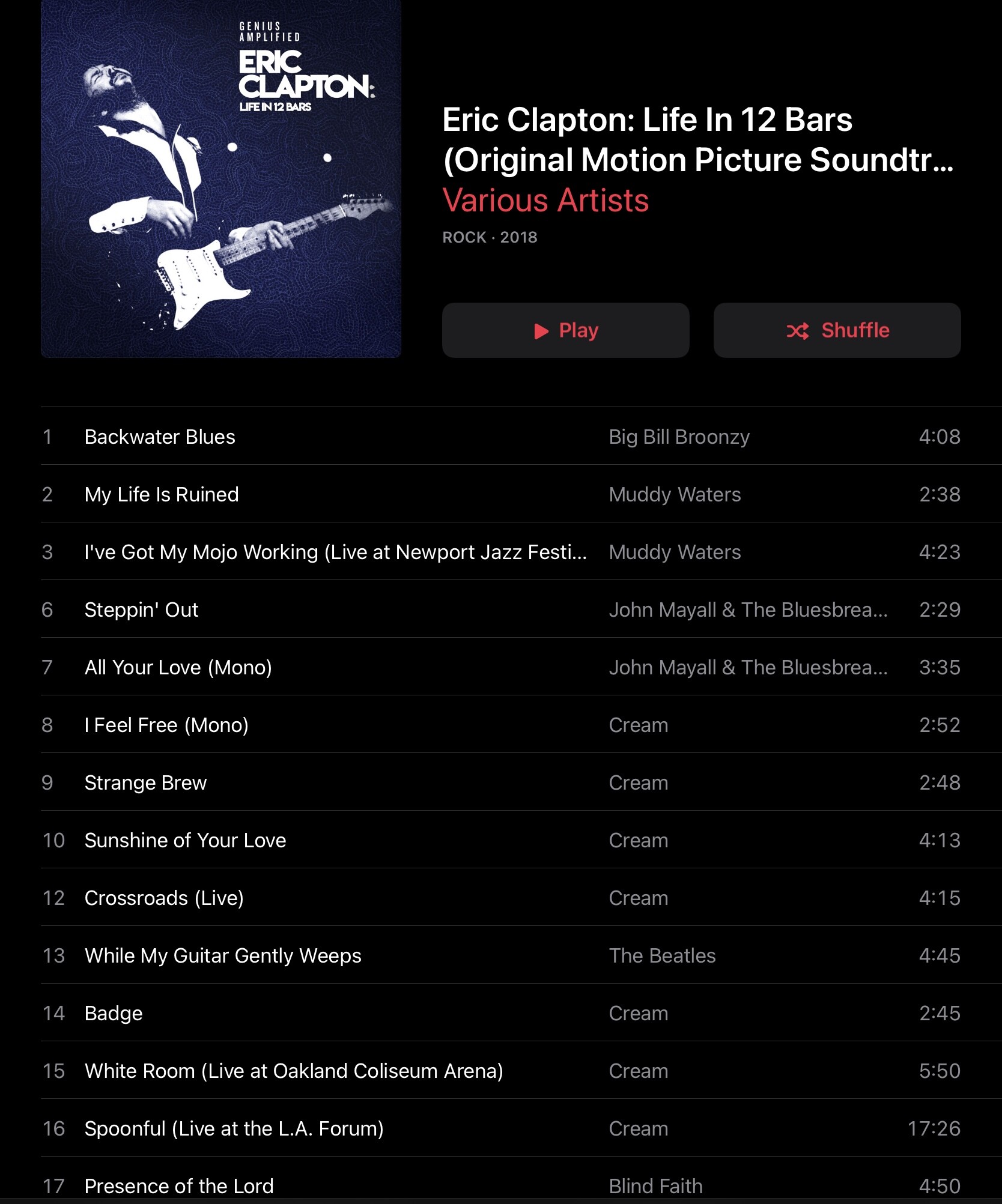 Eric Clapton. Life in 12 bars. It was @AlanP who recommended a particular track off this collection but it looked so good I loaded up all the tracks my provider would allow (27). A wonderful history of an artist. 17 minutes of Spoonful at LA Forum stood out.
