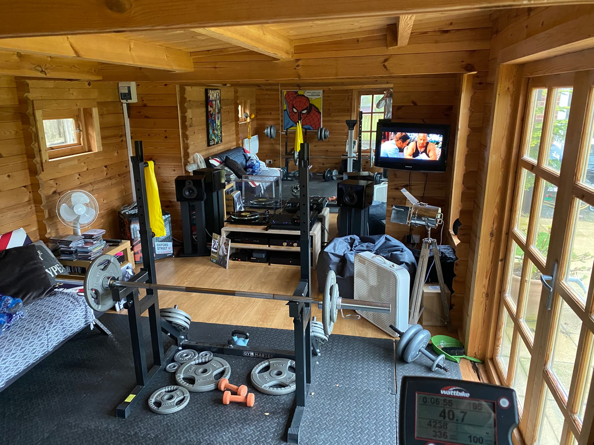 DJ Shadow providing the tunes whilst having a session on the Watt Bike given it’s not exactly the day for being on a real bike.
